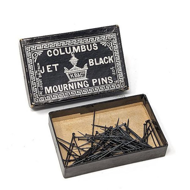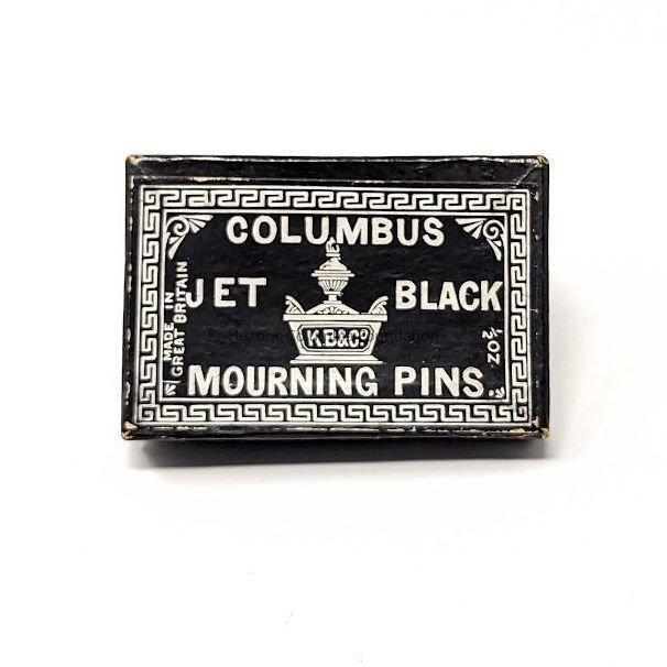 Black cardboard box and black metal pins of various sizes. The adhesive label has white font. The center features a crypt-like image, surrounded by the words "Columbus Jet Black Mourning Pins" and a Greek key pattern. Smaller wording along the border notes that the contents were made in Great Britain and weigh half an ounce.Use