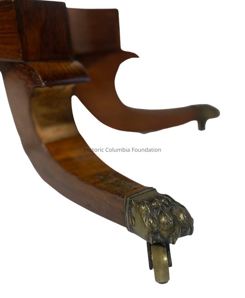 Regency style card or game table with a fold top. Made of rosewood veneer as the primary wood and yellow pine as the secondary wood, the rosewood top has a wide crossbanding inset with stylized brass medallions. When rotated and folded into a table, the table is topped with a yellow felt. The top rests on a tapered square pedestal with similar brass stylized foliage sprays inlaid, supported by a quatrefoil platform base with a foliage band. The table has simplified reversed "C" scroll legs, tipped with brass lion paw feet on brass casters. The card table is signed “Mr. Gravenor Portsed” on top of the pedestal.Context