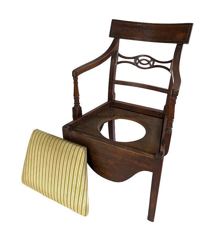 Chair with removable upholstered seat revealing a fitted compartment for a chamber pot. The crown of the chair has a carved entablature with an open horizontal back splat. The arms of the chair are slightly shaped with fluted lines and are supported by baluster turned supports. There is a deep scalloped wooden skirt between the slightly tapered legs.Use