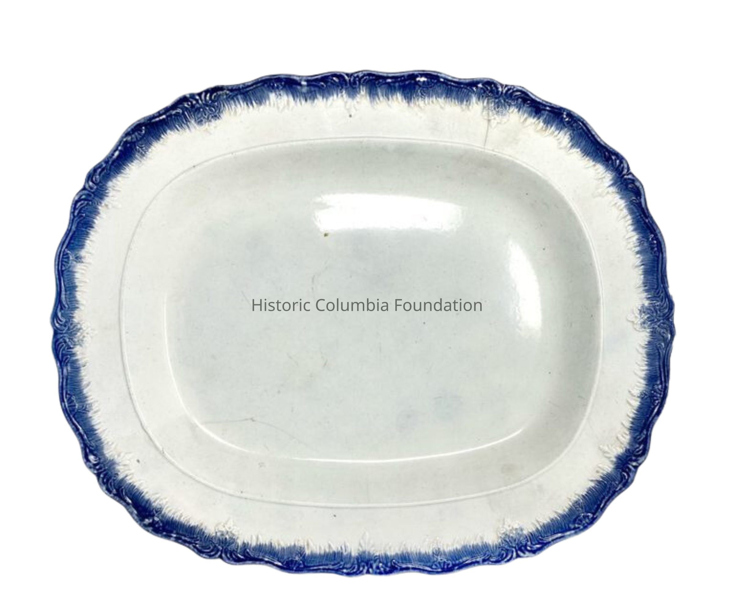 Blue shell-edge pearlware oval platter with blue slip. The piece is press molded and the back is impressed with the maker's mark. The backside shows stilt marks in three places: each mark has three holes in a triangular pattern.Context