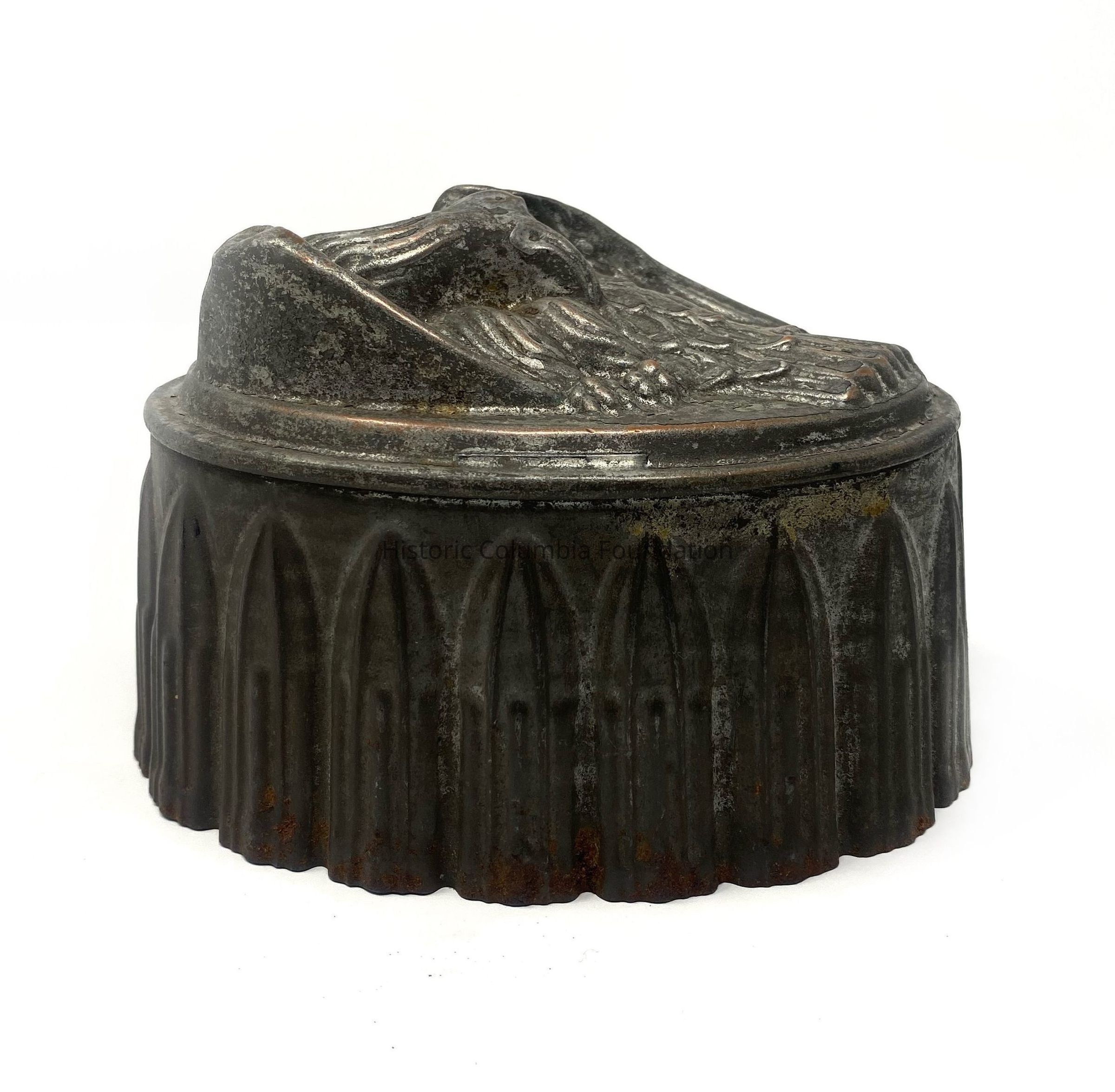 Copper gelatin mold featuring a bird. It has ribbed arch fluting on the sides.Context