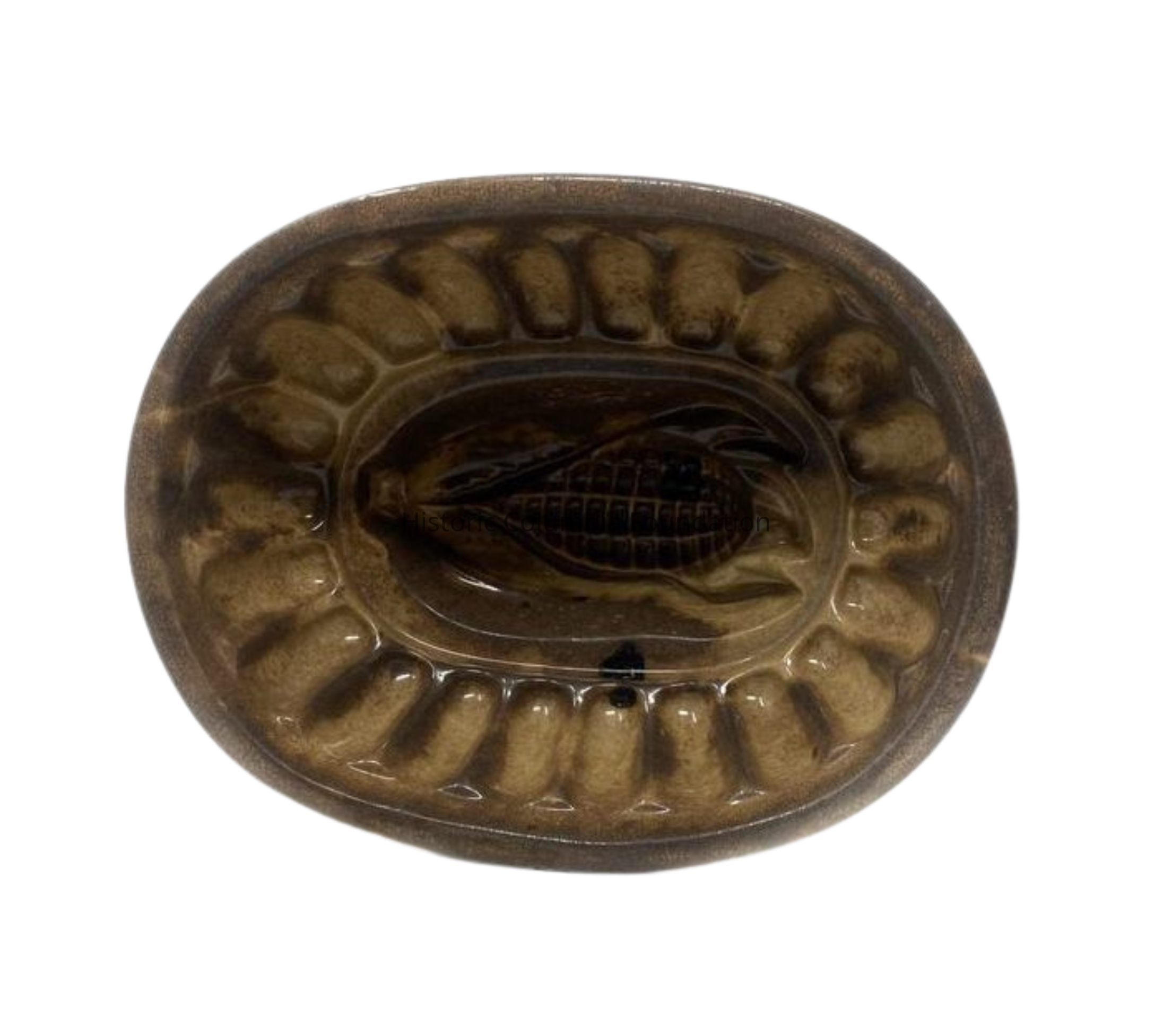 Ceramic oval-shaped pudding mold. It has ribbed sides and features a corn cob pattern at its peak.Use