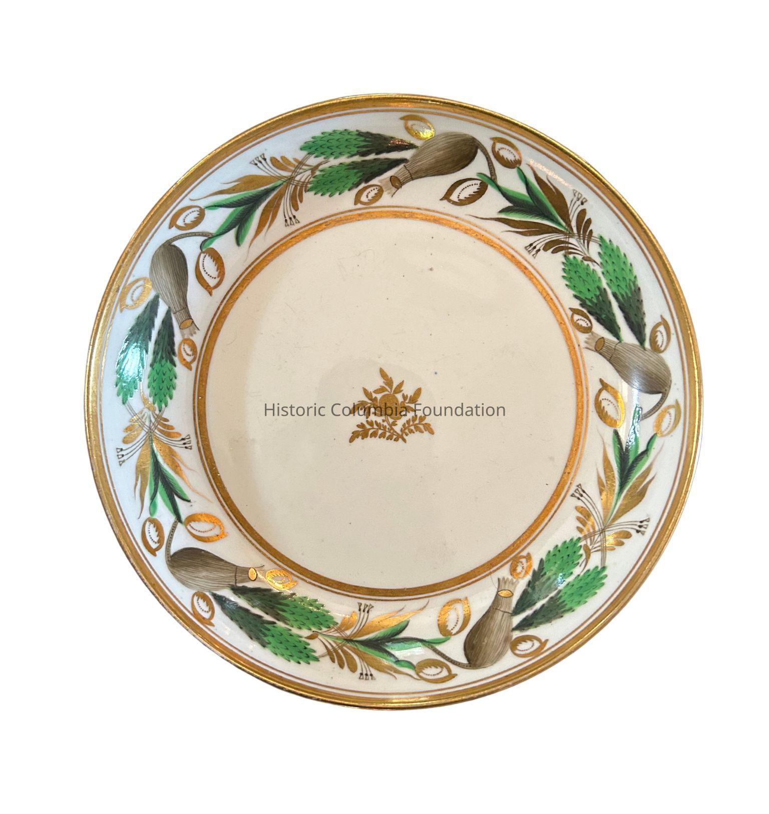 White ceramic plate with gold banding. The plate features a green and brown leaf motif design. The center of the plate has a golden leaf design. "357" is inscribed on the bottom of the piece.Context