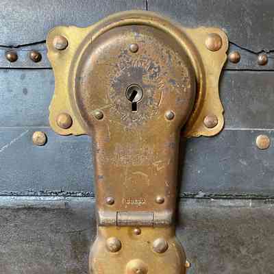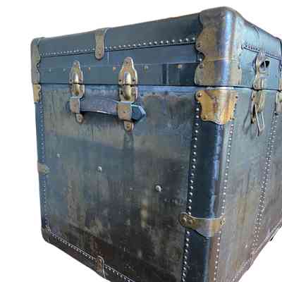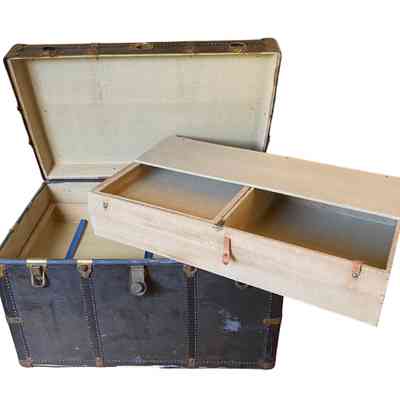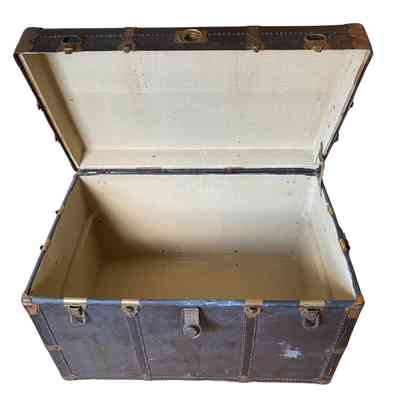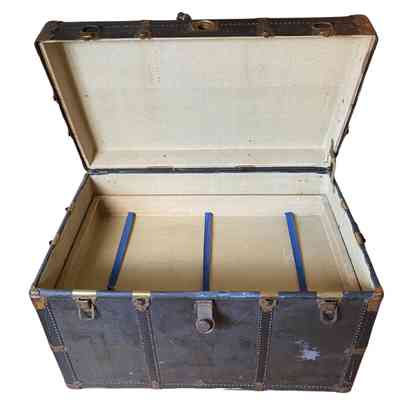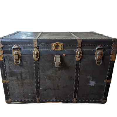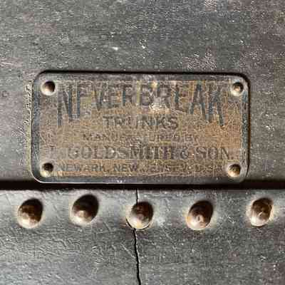 Black steamer trunk with metal hardware and leather handles. It contains three removable shelves on the interior covered in beige fabric. A metal plate on the top of the trunk reads, "NEVERBREAK TRUNKS / MANUFACTURED BY/ L. GOLDSMITH & SON / NEWARK, NEW JERSEY, U.S.A." The lock on the front of the trunk is similarly inscribed, "L. GOLDSMITH & SON / NEWARK, N.J. / NEVERBREAK TRUNK," along with "UG230" in smaller letters.Made/Created