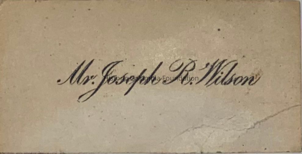Presbyterian theologian Joseph Ruggles Wilson (1822–1903) was the father of several children with his wife, Janet "Jessie" Woodrow Wilson (1830–1888), including President Woodrow Wilson (1822–1903). The family moved around the southeastern United States as Joseph served as a pastor in several states, including Virginia, Georgia, North Carolina, and South Carolina, and as an educator in Virginia, Tennessee, and South Carolina. From 1870 to 1874, he served as a professor at Columbia Theological Seminary (now known as the Robert Mills House). The Wilsons lived in Augusta for thirteen years before moving to Columbia. It is uncertain when, and therefore where, this calling card was used by Joseph.Inscription/Signature/Marks