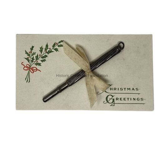 Although this card is unsigned, it may have been given as a Christmas gift with the attached dance card pencil. Dance card pencils were reusable devices carried by women in the eighteenth and nineteenth centuries to balls and other social events that involved dancing. These ornate metal pencils were attached directly around the user's wrist or to the dance card one received at the beginning of the event. A dance card was specific to the evening, listing the different dances or song titles to be played. Using the pencil, a woman could write the name of each partner with whom she planned to dance beside the individual songs or dances. These cards, while functional, also served as a keepsake of the evening.Dimensions