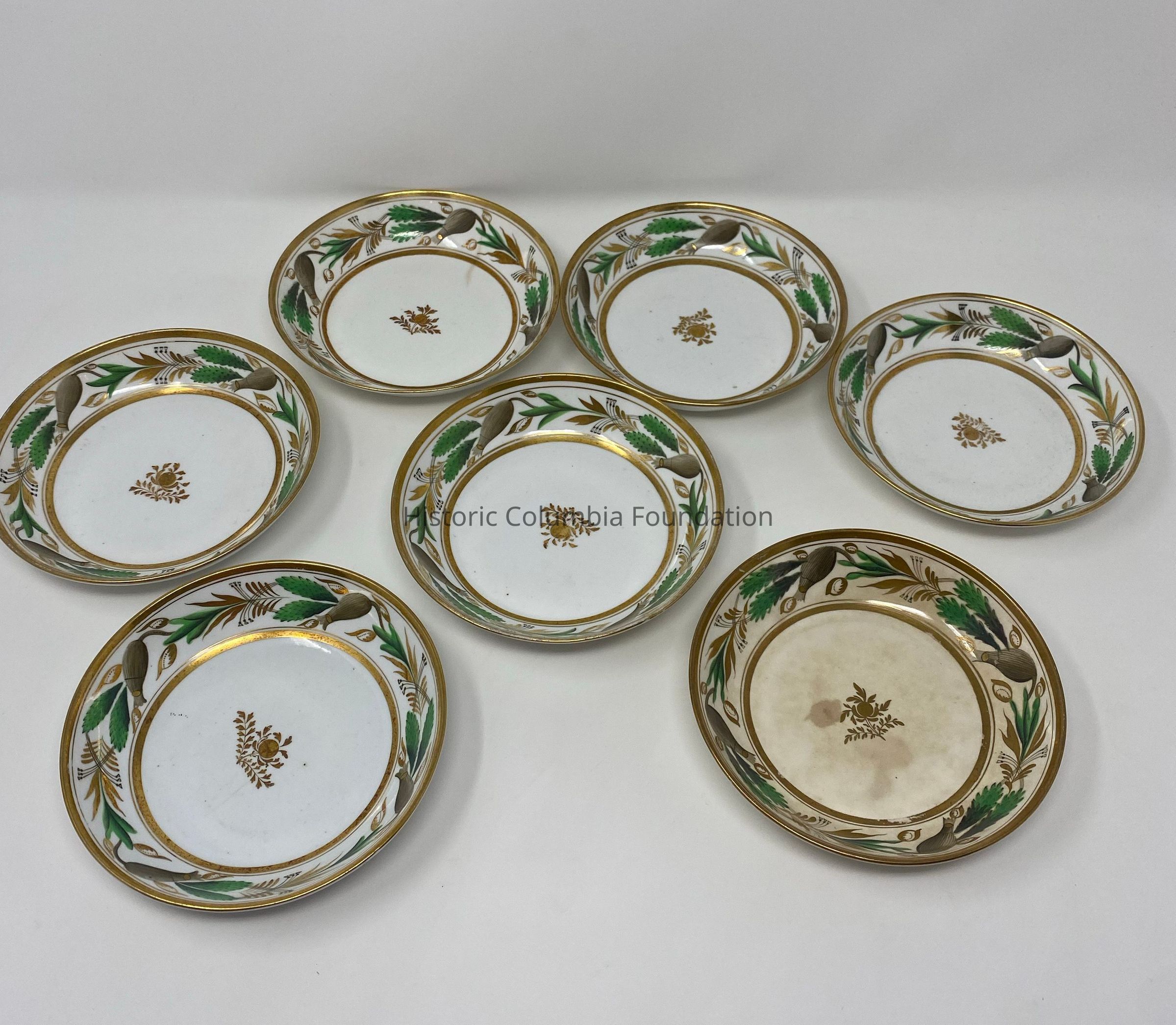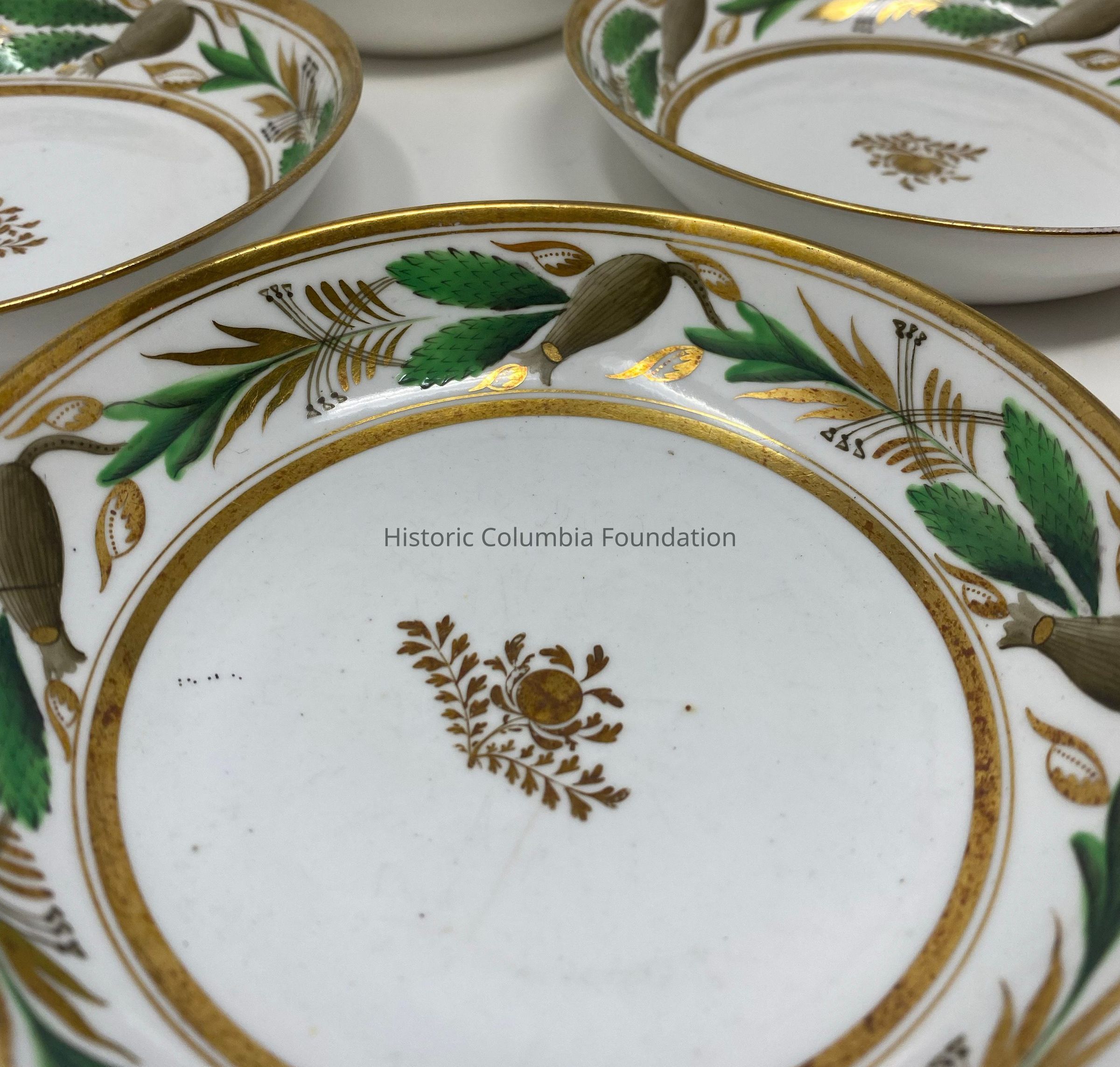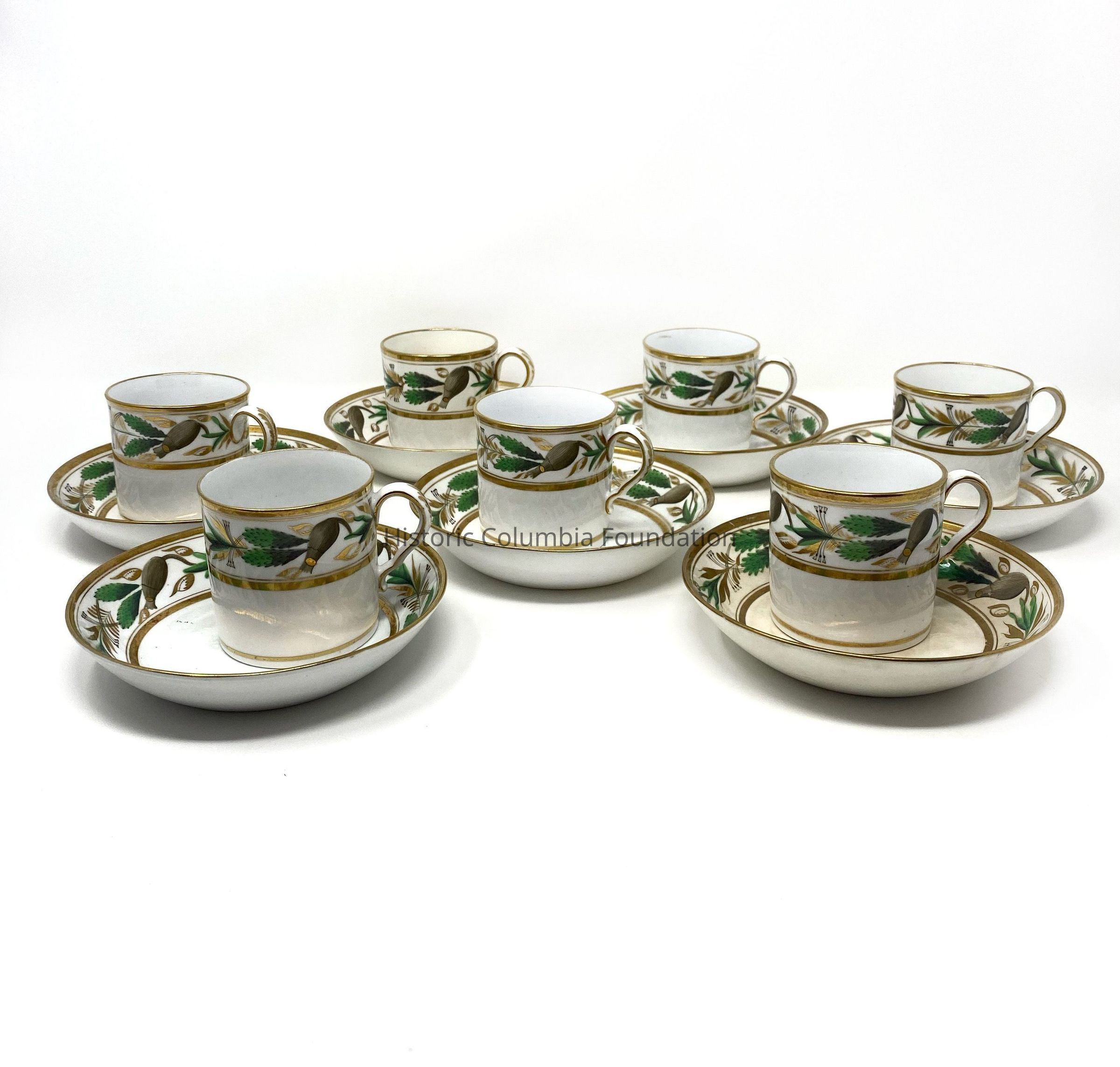 Seventeen white ceramic saucers with gold banding. Each features a green and brown leaf motif design. The center of each saucer has a golden leaf design. "Spode 357 9" is written on the bottom of the majority of the cups (A,B,C,I,J,K,L,M,O,P) while some of the cups say "357" on the bottom (D,H,N).Context