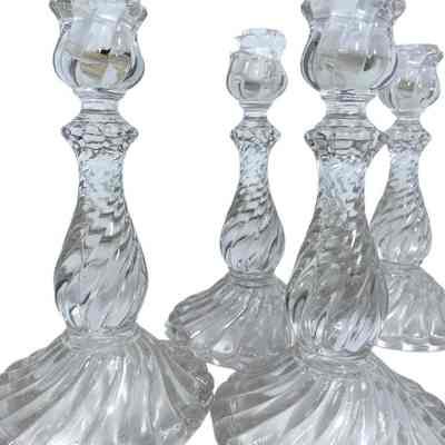 Four molded glass candlesticks. The identical clear glass candlesticks feature a twisted rib shape around the sconce, stem, and base.Context