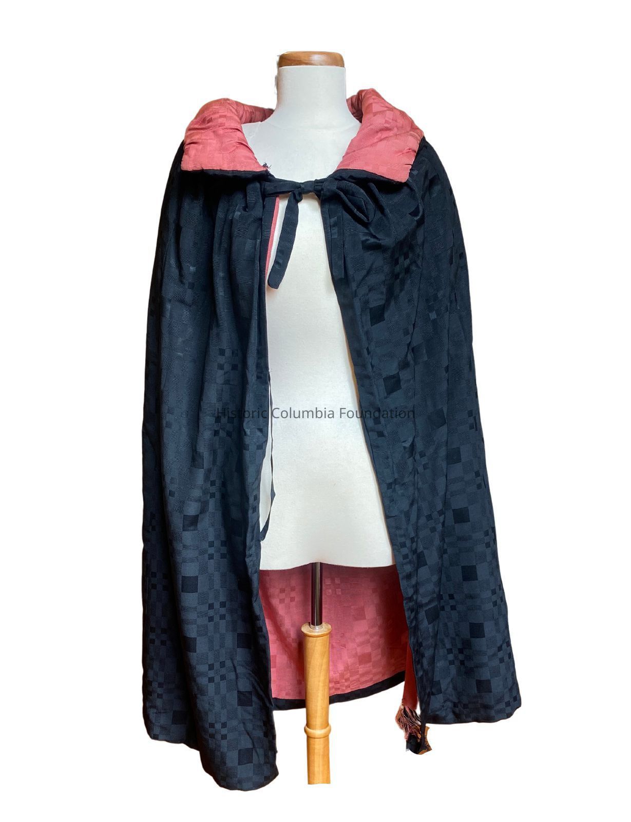 Black silk cape with pink lining of same fabric. The cape has a high collar with a tie at the neck. At the center near the edge, there is a loop on each edge to close the cape. There is also a hook and eye closure at neck. An interior label reads "F.B. Shackelford Co., Smart Apparel for Women and Misses, Columbia, SC."Context