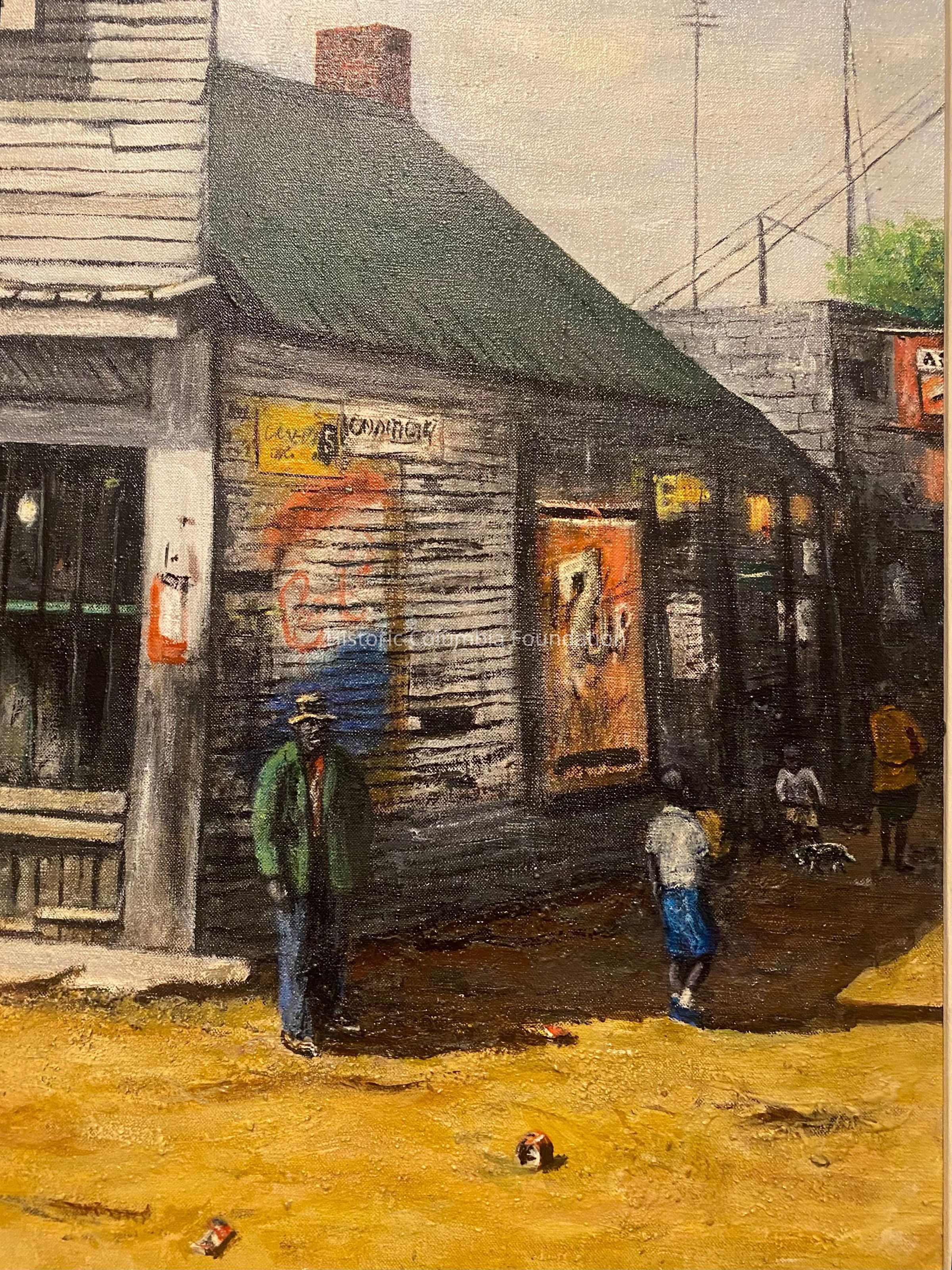 Painting of white wooden storefront with a green roof and green doors. There are bars over the windows and various posters and advertisements on the exterior walls. The background shows tops of trees and telephone poles. The business name, "Baker's Grocery," hangs on a sign on the front of building with a Coca Cola logo above it. Six individuals, mostly children, stand separately near the store, all of whom are African American. One child looks through the store's front doors, each of which have six lights, or windows.The store sits on a dirt road. The signature of the artist is in the top right corner of the painting in green font.Type of Painting