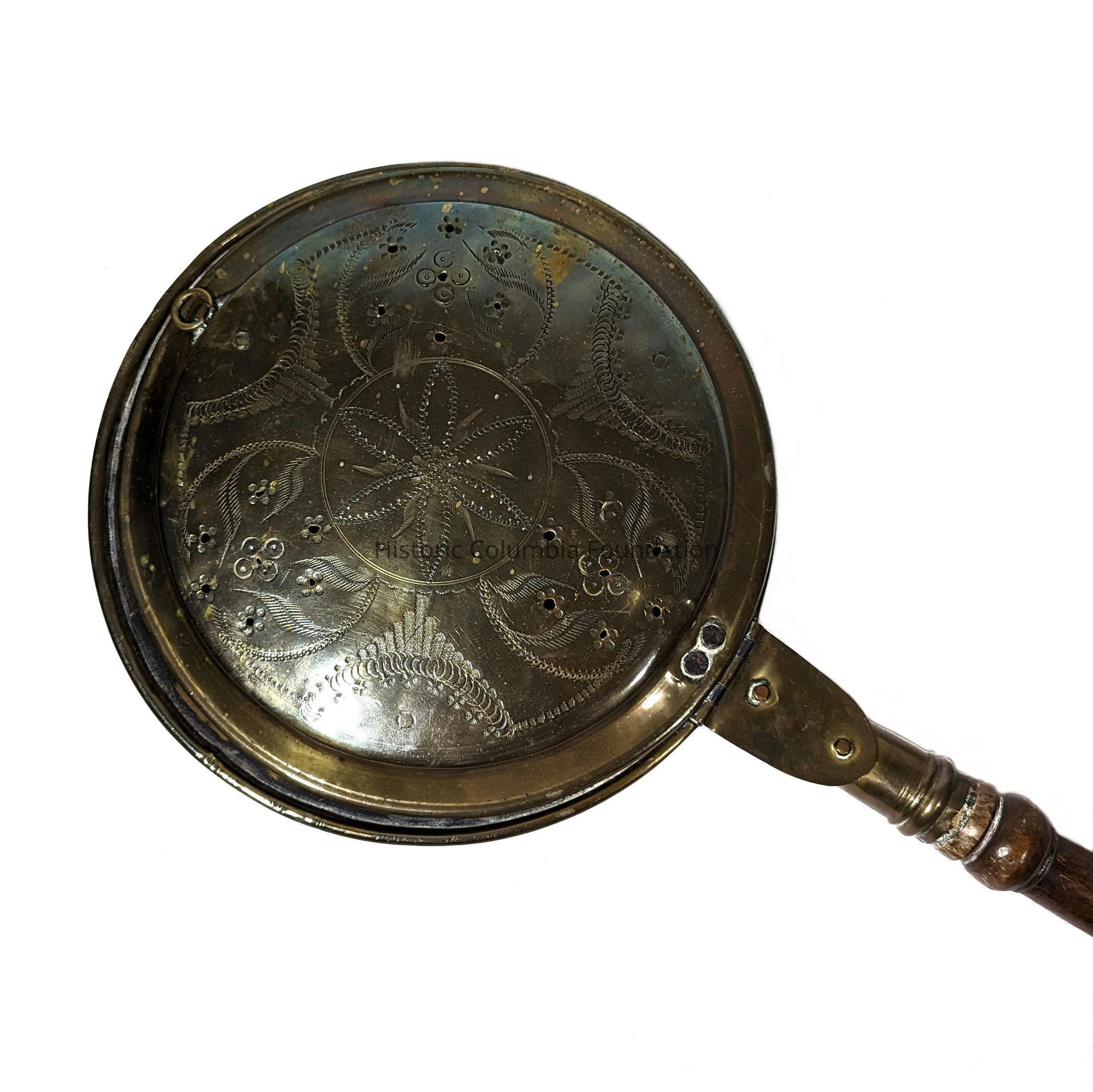Also known as bassinoires, bed warmers were used as heating instruments. After lifting the cover on the pan, the user would place hot coals in the receptacle and replace the cover. Then, holding the long wooden handle, the user placed the brass pan under the bed coverings to warm the bed at night.