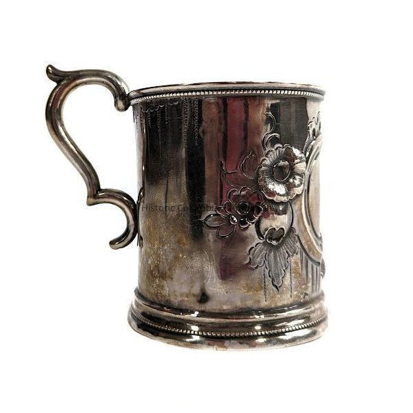 Southern coin silver cup with beaded rim. Most of the cup is smooth. The side of the cup opposite the handle features a floral chased cartouche with engraved initials "WEH." The underside is marked with a fleur-de-lis overstruck with maker's mark "J. Veal" inside a rectangle.Context