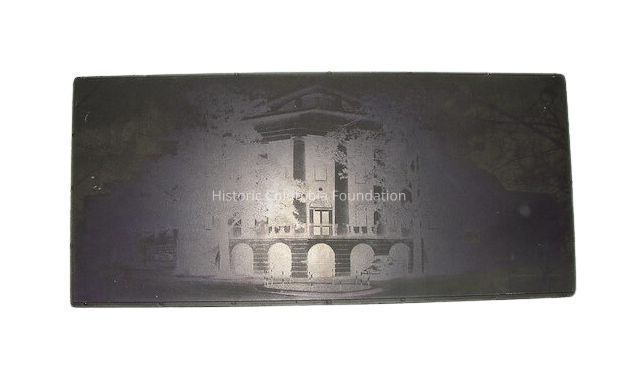 Engraving plate of the north facade of the Mills Building on the campus of the former South Carolina State Hospital. The image on the plate is nearly symmetrical: a large building with a pediment, six ionic columns, and five archways entering the lower floor is partially obscured by two large trees on either side. There appears to be a water feature in the foreground of the building. No staircase is present from this view. The plate is made of wood block with paper backing. The front of the plate is black in color from repeated ink use. Twenty (20) small metal nails are used to attach the top of plate to the wood back.Use