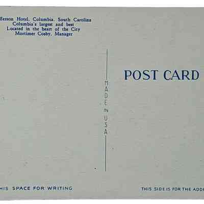 The back of the postcard includes a brief description of the building: "Jefferson Hotel, Columbia, South Carolina / Columbia's largest and best / Located in the heart of the City / Mortimer Cosby, Manager." The lefthand side includes a note acknowledging the publisher: "Published by Asheville Post Card Co., Asheville, N.C." The postcard contains no written message and was never mailed.Subject