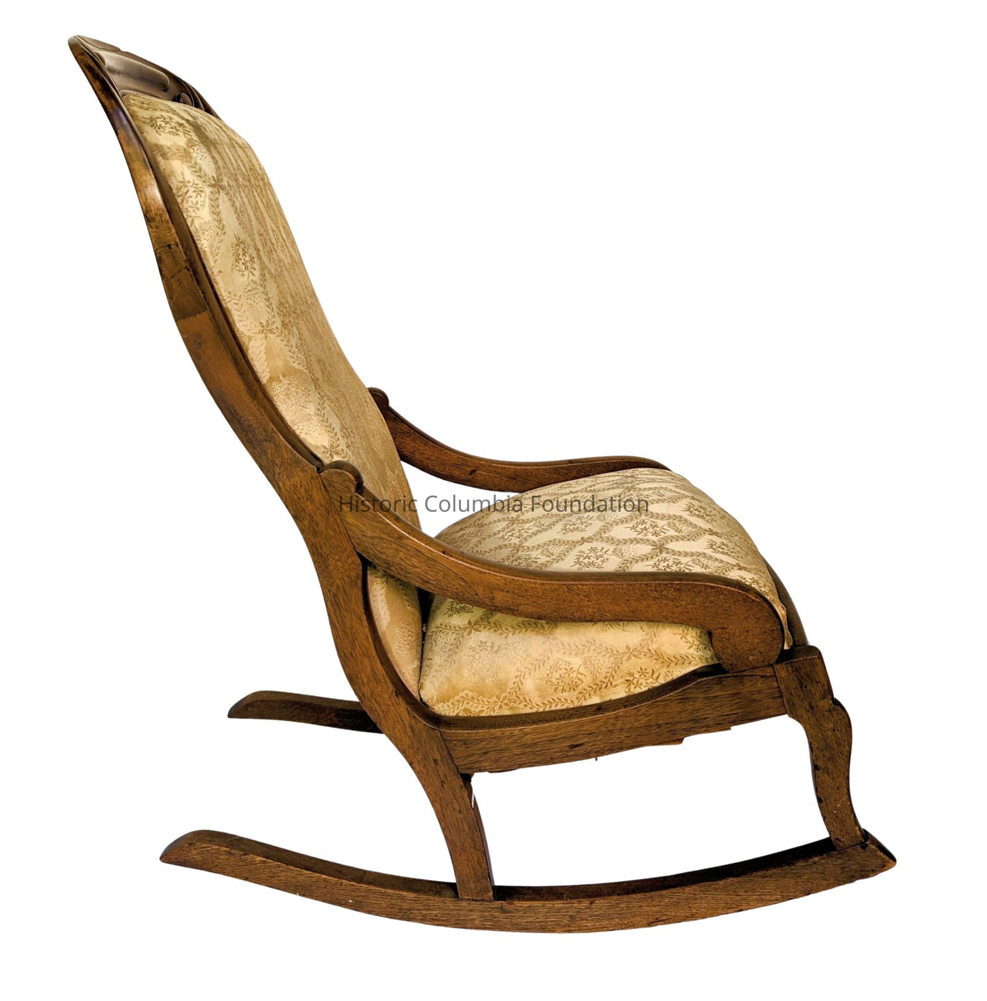Small walnut rocking chair with gold brocade upholstery. There is a simple floral carving near the top on the back.Context
