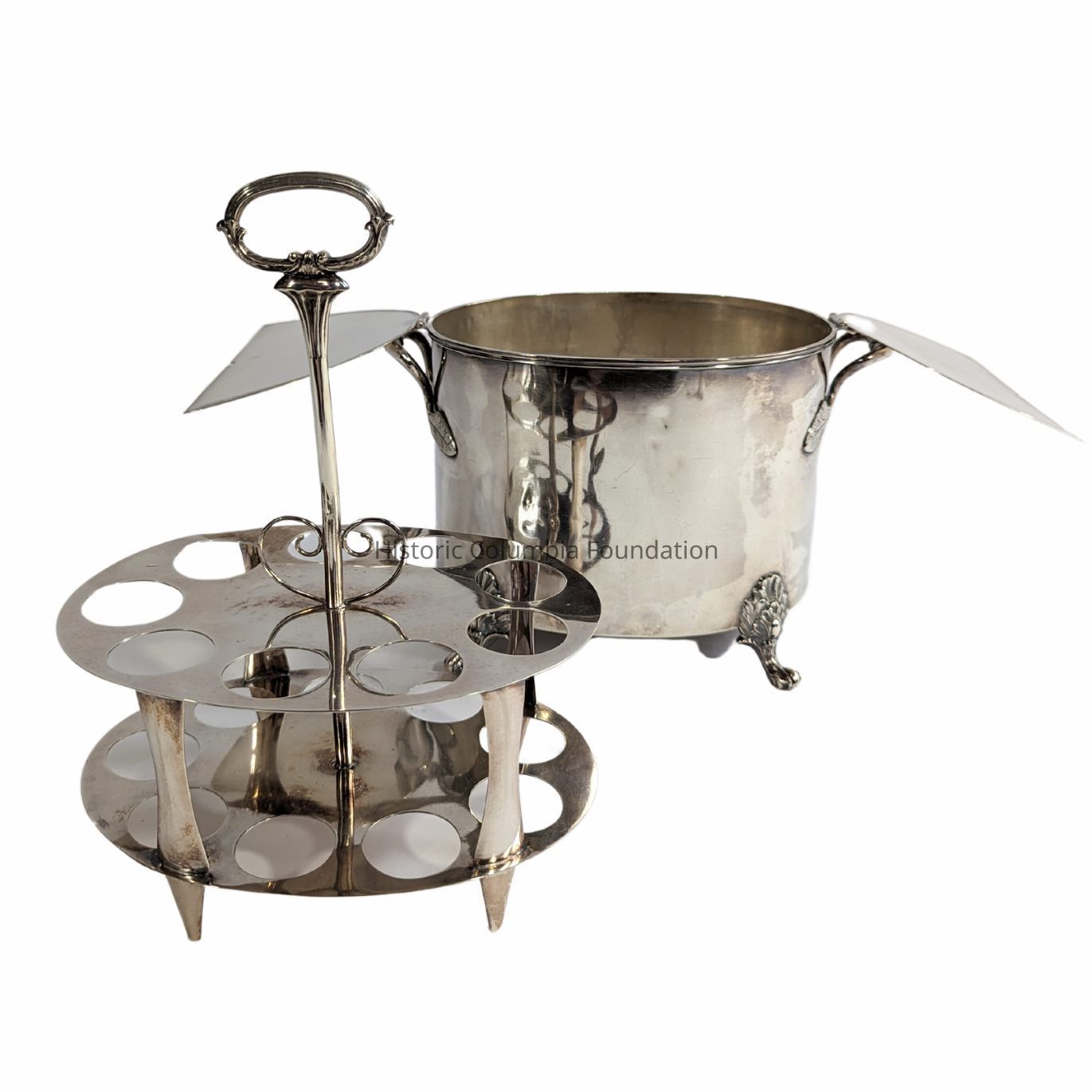 Egg warmer made of American coin silver. It is comprised of an oval container with scroll feet, leaf-form shoulders, and an internal oval plate with two levels, each with nine cutouts. It has tapered feet, a central shaft, and ring handles. There is a handle on each side of the external container as well as a vine-form handle on the internal plate. The two lids are hinged to open at the center. The underside of the base is engraved "Wade Hampton 1835" and the face is engraved with a "W H" monogram.Use