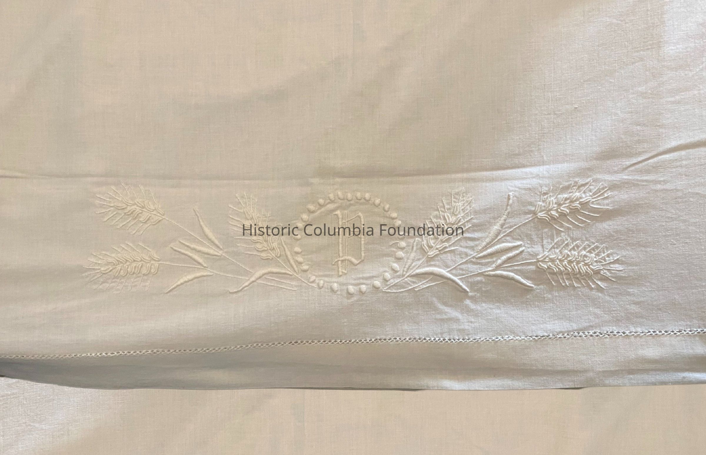 Off-white linen bed sheet. It contains hemstitching along with a barley-inspired design surrounding a capital "P" embroidered in cursive.Textile Type