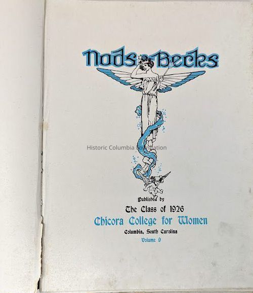 Black and silver "Nods and Becks" yearbook for Chicora College for the 1926 school year. The cover states the title of yearbook and associated school year, as well as includes a silver seal of the school and a depiction of the Hampton-Preston House.Context