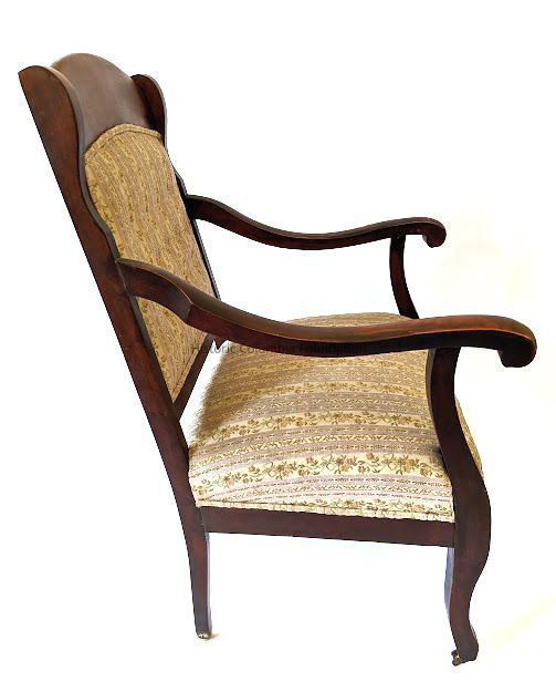 Arm chair with arched crown rail and figured veneer. There is a slight cabriole to the front of the legs and the arms are slightly corned with scroll terminals and shaped supports. The seat and button backs are upholstered with blue floral pattern and stripes.Context