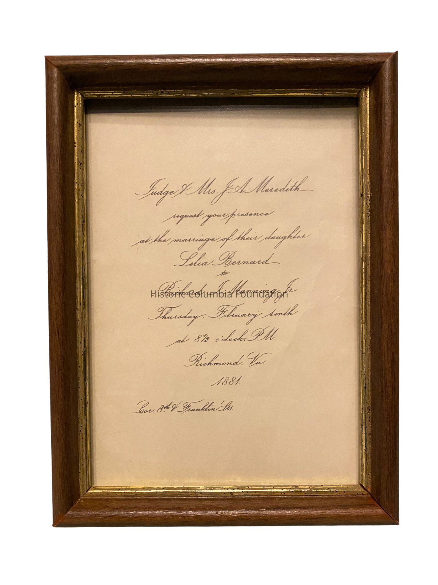 Invitation to the wedding of Richard Manning and Lelia Meredith in Richmond, Virginia. The paper invitation is in a wooden frame with a gold interior border.Context