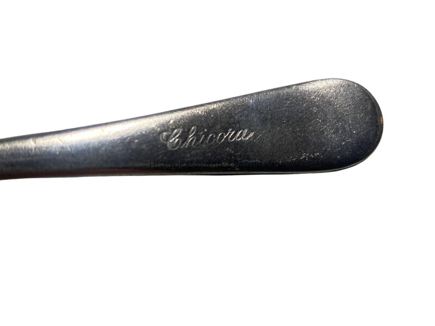 Two plain long, thin iced tea spoons engraved "Chicora" on the front of each handle. Both spoons have different maker's marks on the back of their handles.Context