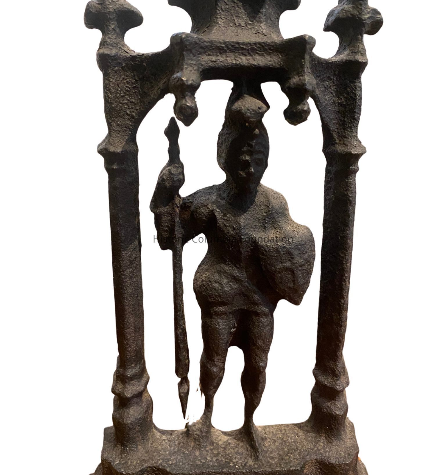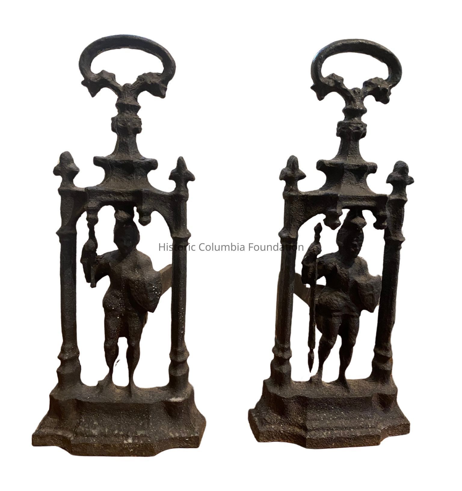Pair of cast iron Gothic andirons, featuring an armored soldier standing under a gothic style arch. The figures are both holding pikes. They each contain a shaped handle on the top.