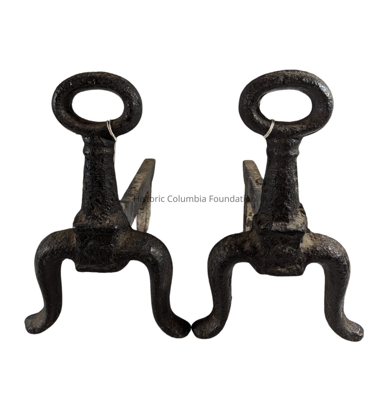 Cast iron fire dogs (also know as andirons) with key-shaped standards and cabriole legs. The log rests are attached at the top of the legs.