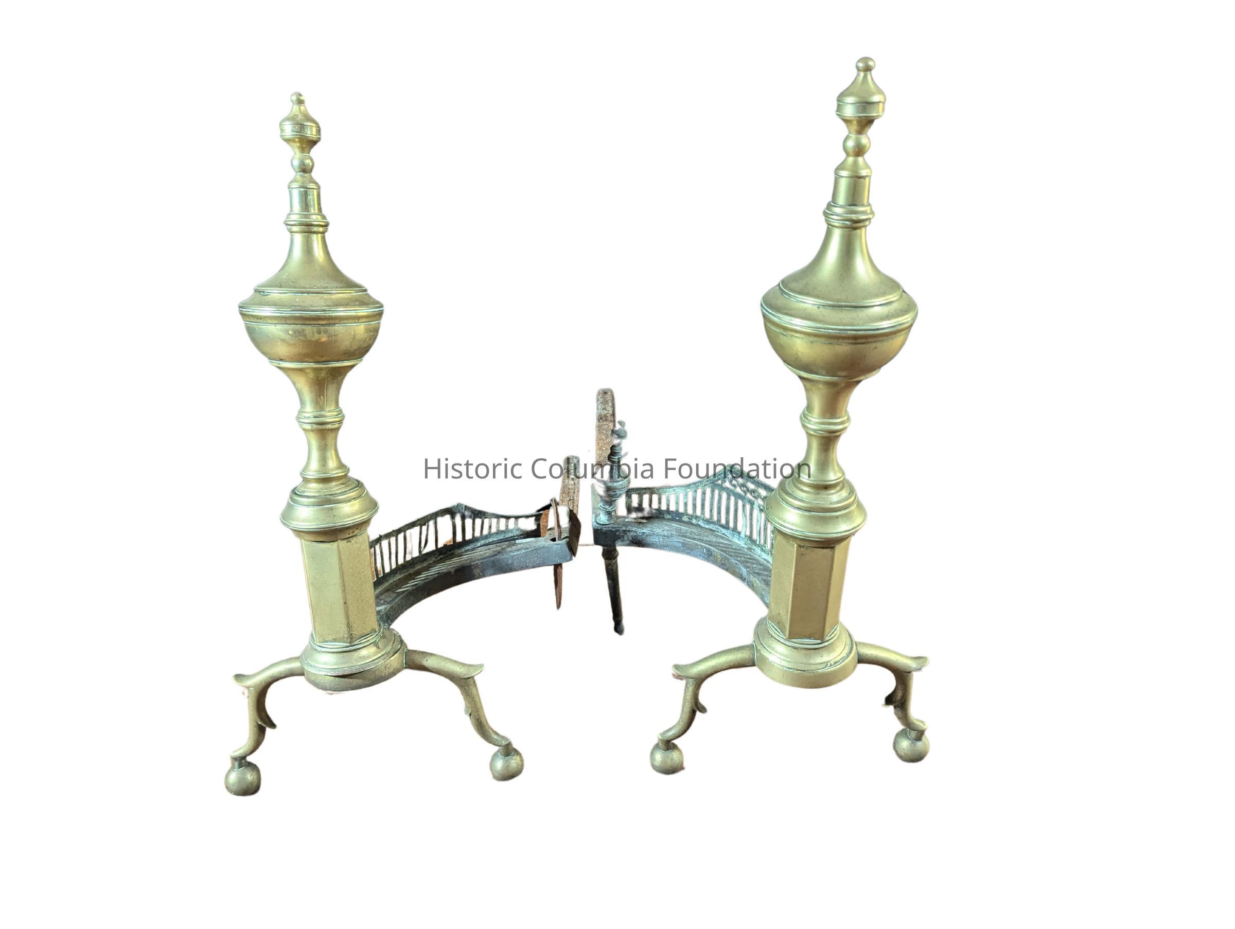 Pair of brass andirons with iron log rests. It has shaped cabriole legs, ball feet, and hexagonal lower standards. It has covered urn tops and other fluted lattice decorations.Use