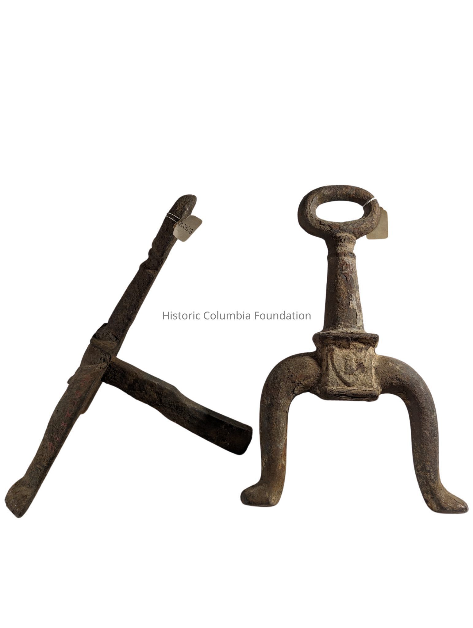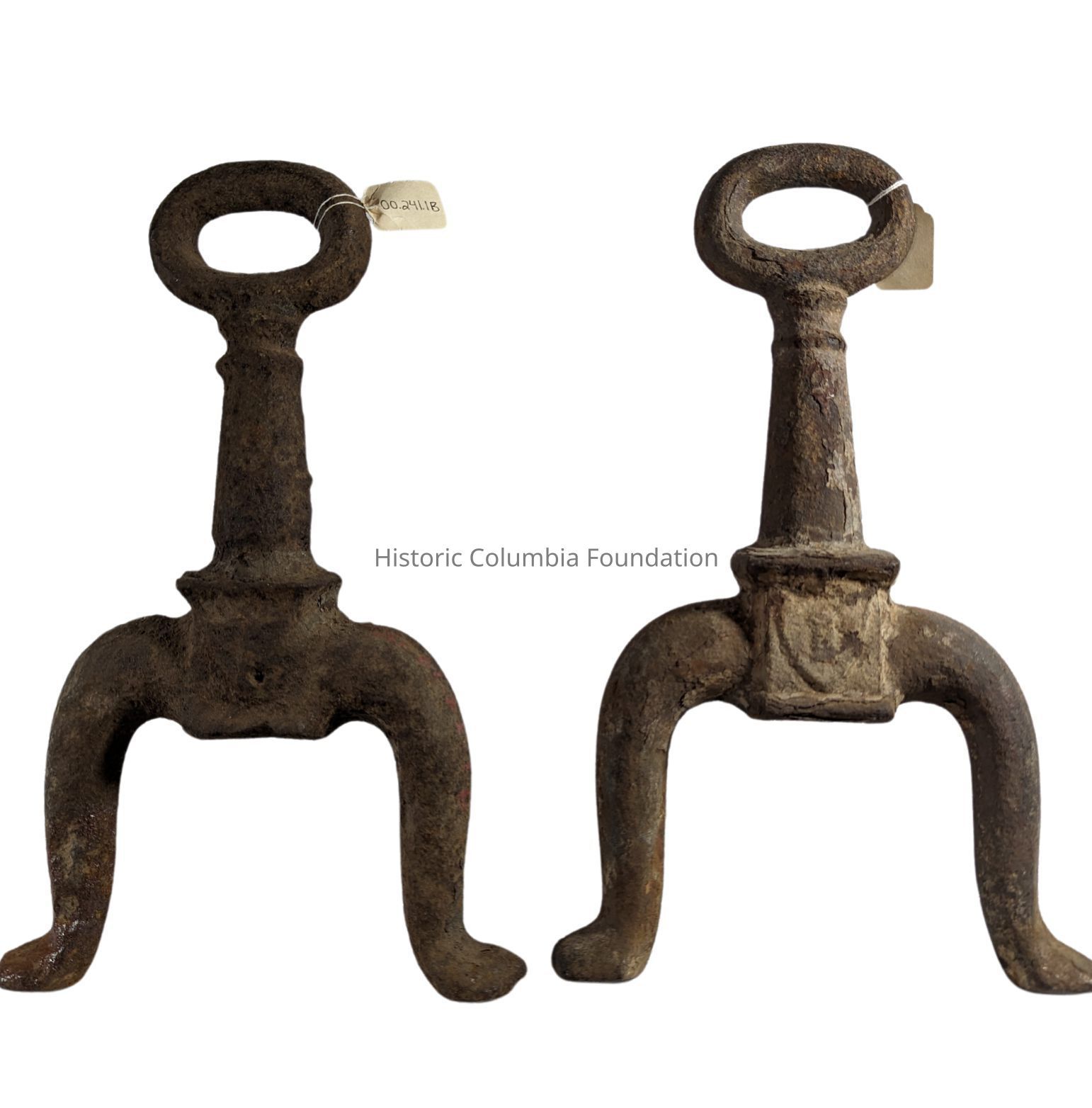 Andirons, also called fire dogs, support wooden logs as they burn in a fireplace. In elevating the logs off the ground, andirons allow air to flow under the logs and create a better fire with less smoke. The vertical key-shaped standards in the front prevent burning logs from rolling off the fire and into the room.