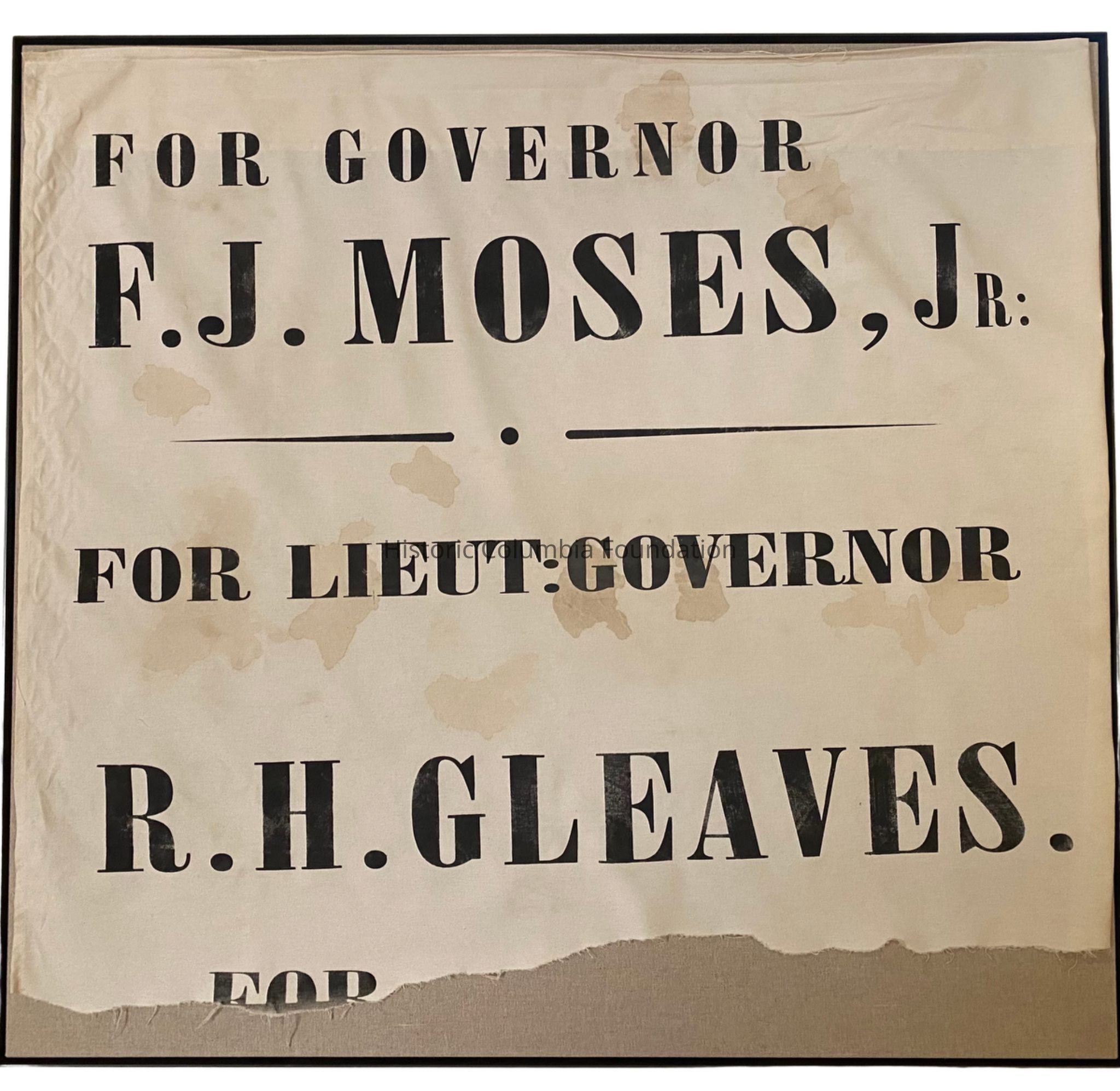 Banner made of coarse cotton with letters stenciled in black ink. The banner reads, "For Governor F.J. Moses, Jr. For Lieut:Governor" and "R.H. Gleaves." The lower portion of the banner is missing, but at one time it would have read, "For Attorney General." There is a slash above the words "For Liet:Governor" that appears to have been hand-painted.