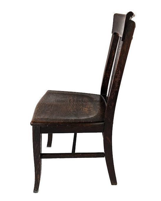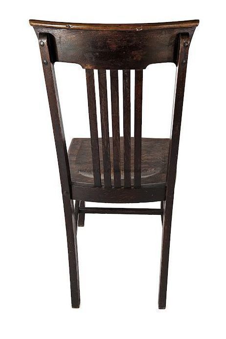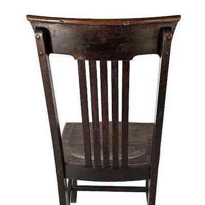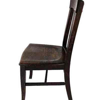 Oak side chair. The chair is dark brown with five vertical-slats grouped together on the back and a cross stretcher supporting the legs.Furniture Details