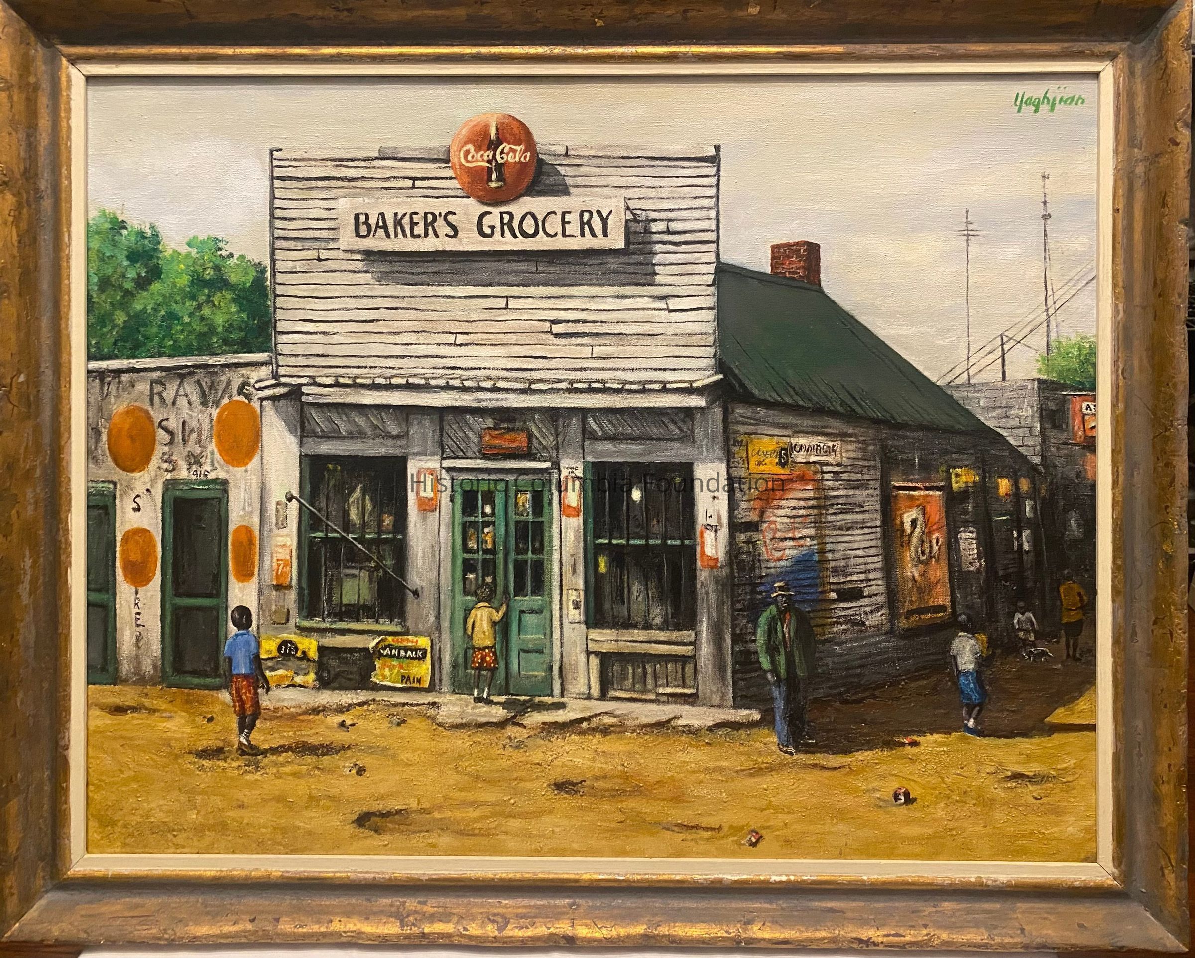 A favorite subject of urban realist painter Edmund Yaghjian (1903-1997), Baker's Grocery was opened in 1926 by Ukrainian immigrant Clara Kligerman Baker at 931 Gates (Park) Street. Situated at the heart of Ward One—a working-class, Black neighborhood that formerly stood south and west of the University of South Carolina's historic campus—the store served as an unofficial community center for area residents, who frequented the establishment to purchase meat, medicine, and general merchandise, in addition to groceries. In 1967, Clara sold the store to long-time employee Oscar Shealy (1938-1977), who would continue its operation until it fell victim to urban renewal efforts around 1970.Made/Created