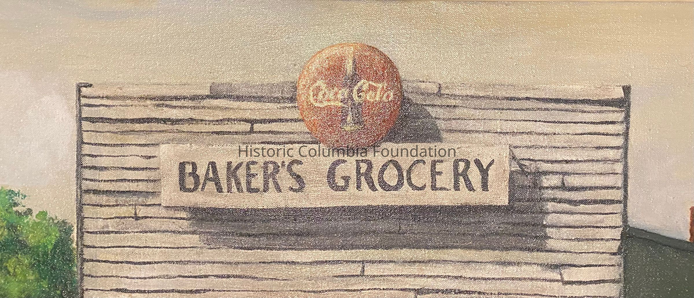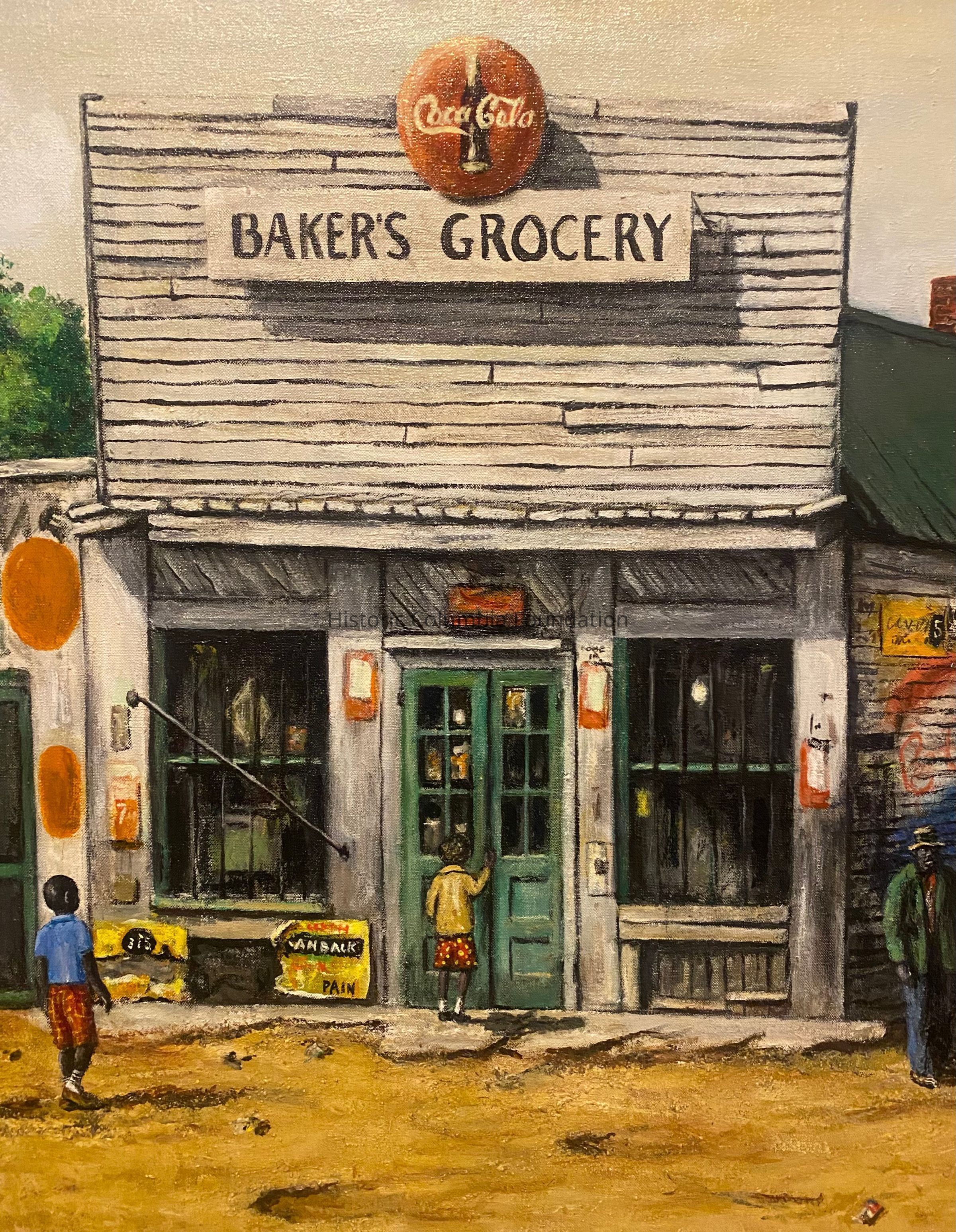Painting of white wooden storefront with a green roof and green doors. There are bars over the windows and various posters and advertisements on the exterior walls. The background shows tops of trees and telephone poles. The business name, "Baker's Grocery," hangs on a sign on the front of building with a Coca Cola logo above it. Six individuals, mostly children, stand separately near the store, all of whom are African American. One child looks through the store's front doors, each of which have six lights, or windows.The store sits on a dirt road. The signature of the artist is in the top right corner of the painting in green font.Type of Painting