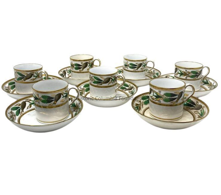 Seven white ceramic coffee cups with gold banding. Each features a green and brown leaf motif design. The center of each cup has a golden leaf design. "357" is written on the bottom one of the cups (cup C).Context
