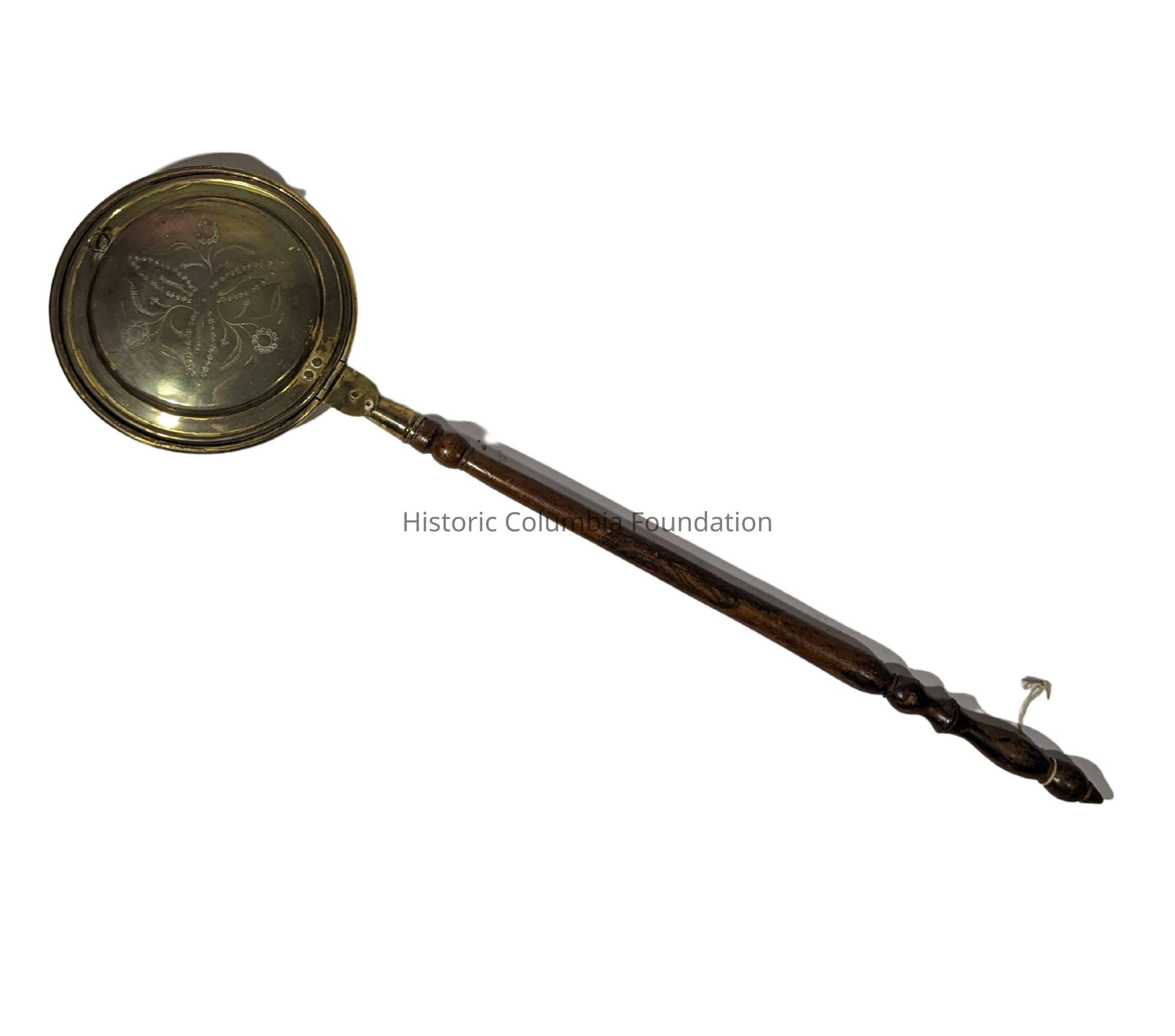 Also known as bassinoires, bed warmers were used as heating instruments. After lifting the cover on the pan, the user would place hot coals in the receptacle and replace the cover. Then, holding the long wooden handle, the user placed the brass pan under the bed coverings to warm the bed at night.