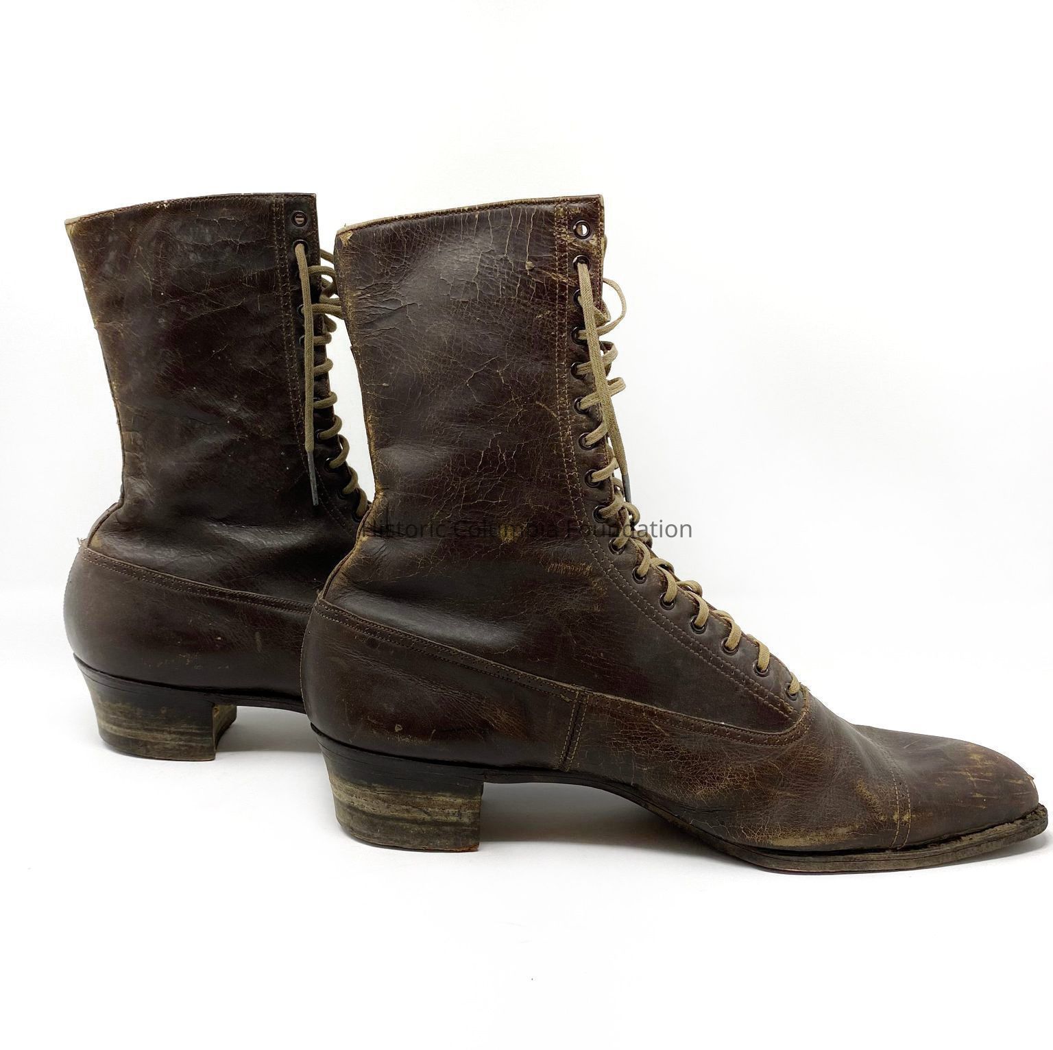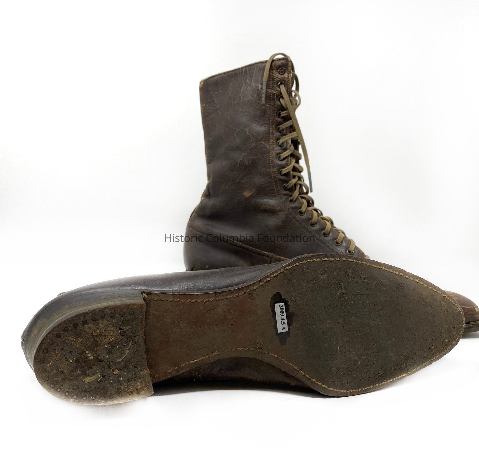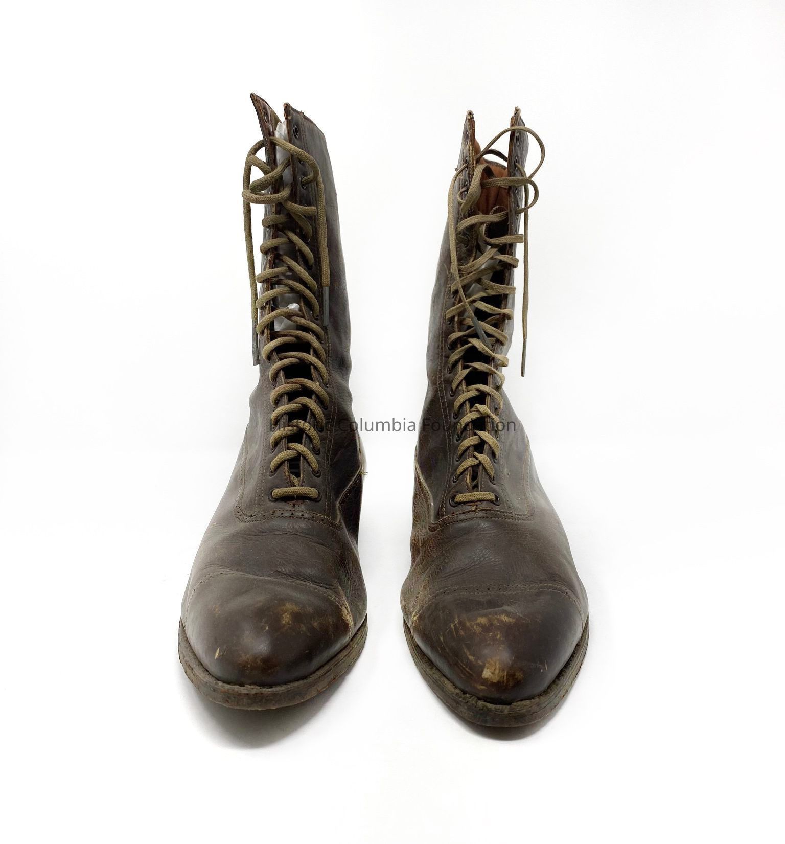 Pair of brown leather boots with tan laces. An inscription on the sole of the right shoe reads: "Tess and Ted, School Shoes."Context