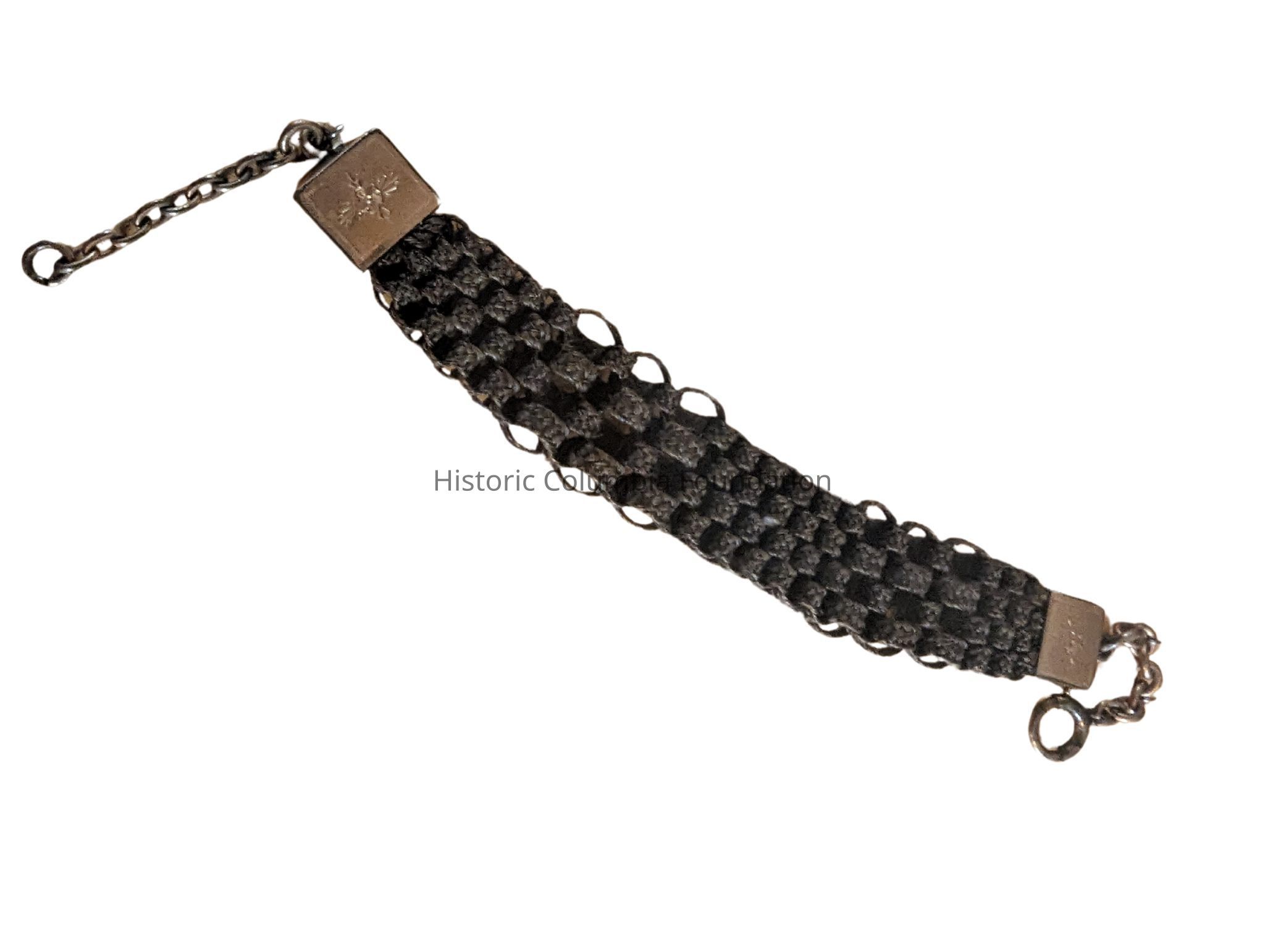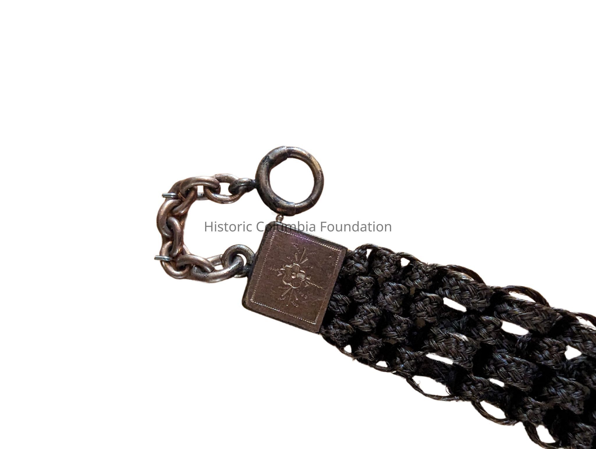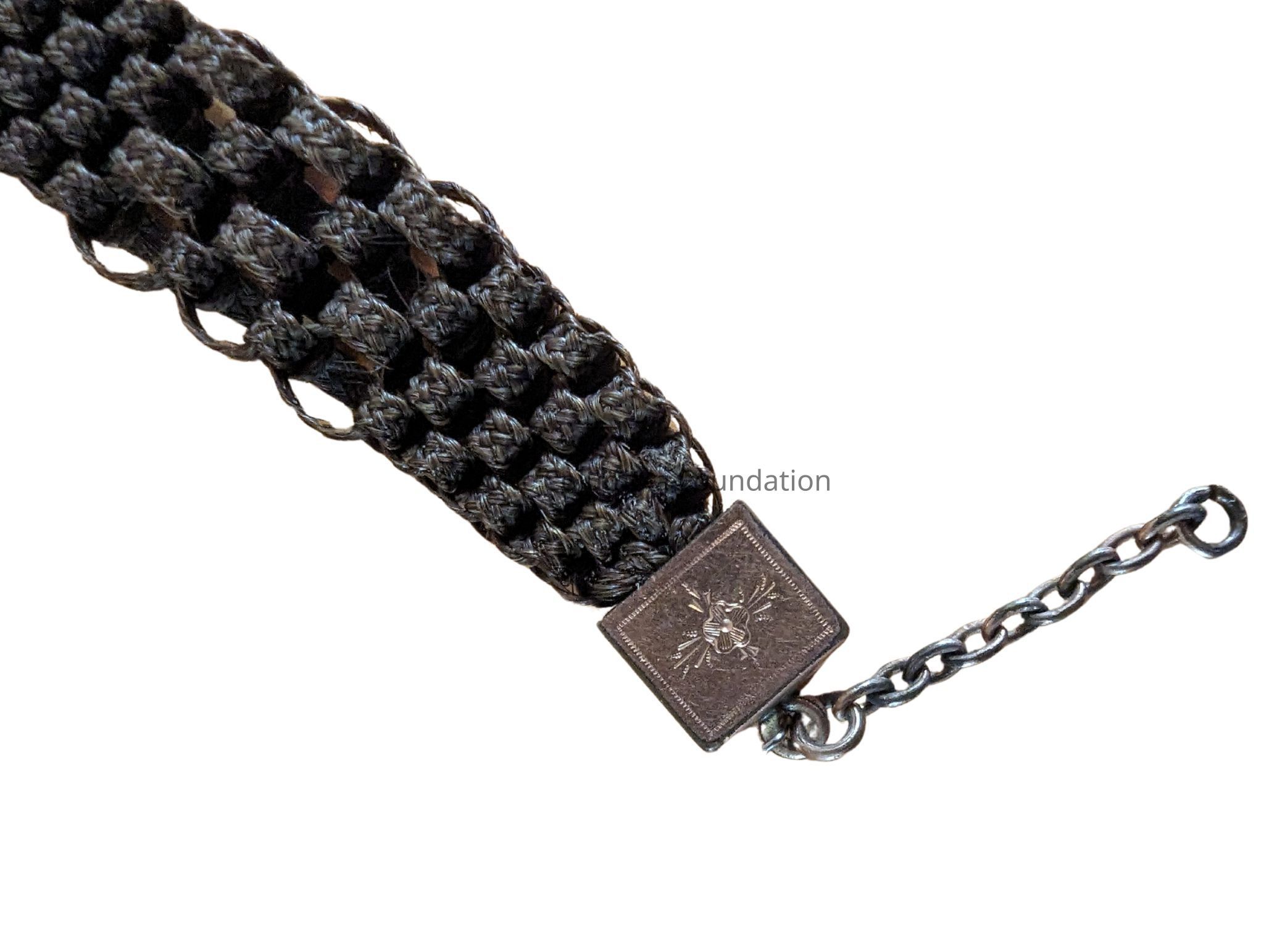 Jewelry made from hair was commonly seen in the late 1800s. It would have been worn for mourning or as a memento. Regardless of the intention, hairwork pieces were incredibly personal. While locks of hair may have been clipped and added within brooches, or the hairs of many different people may have been artistically arranged within a frame, strands of hair could have also been braided or woven into wearable accessories as seen with this bracelet.Context