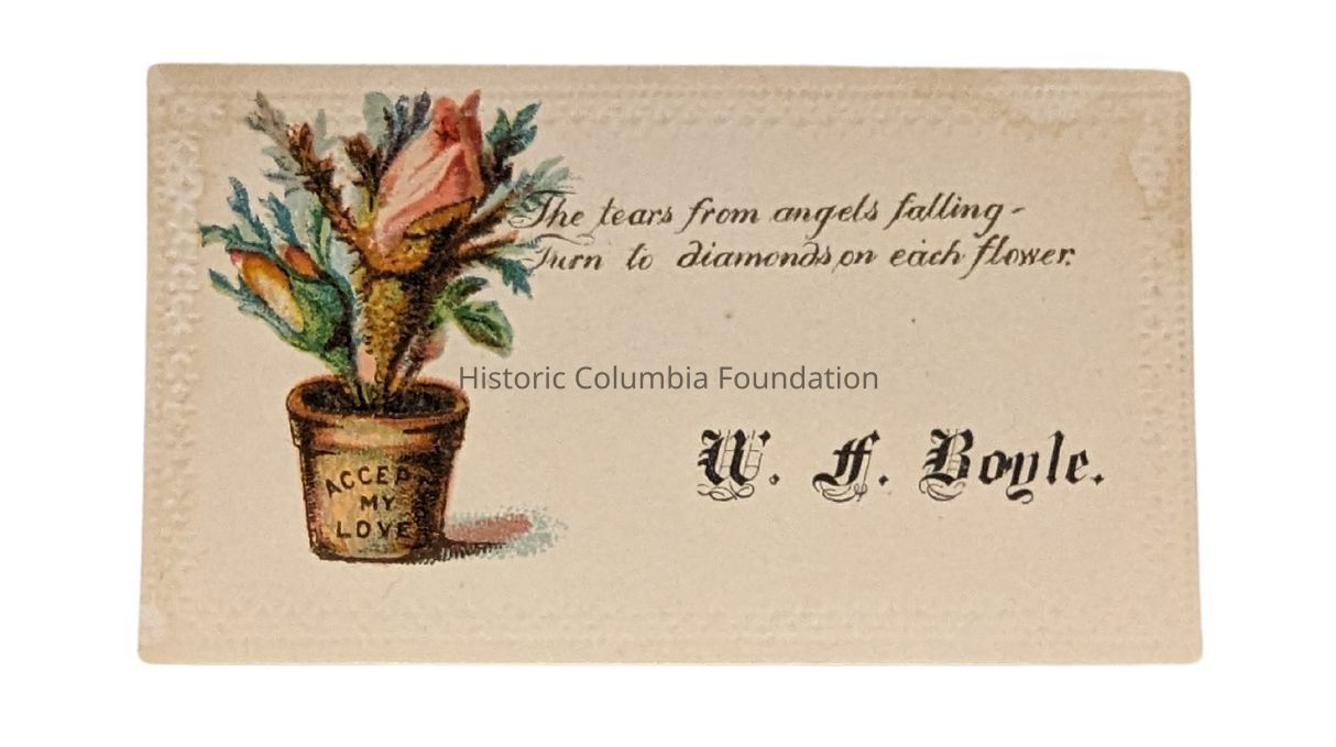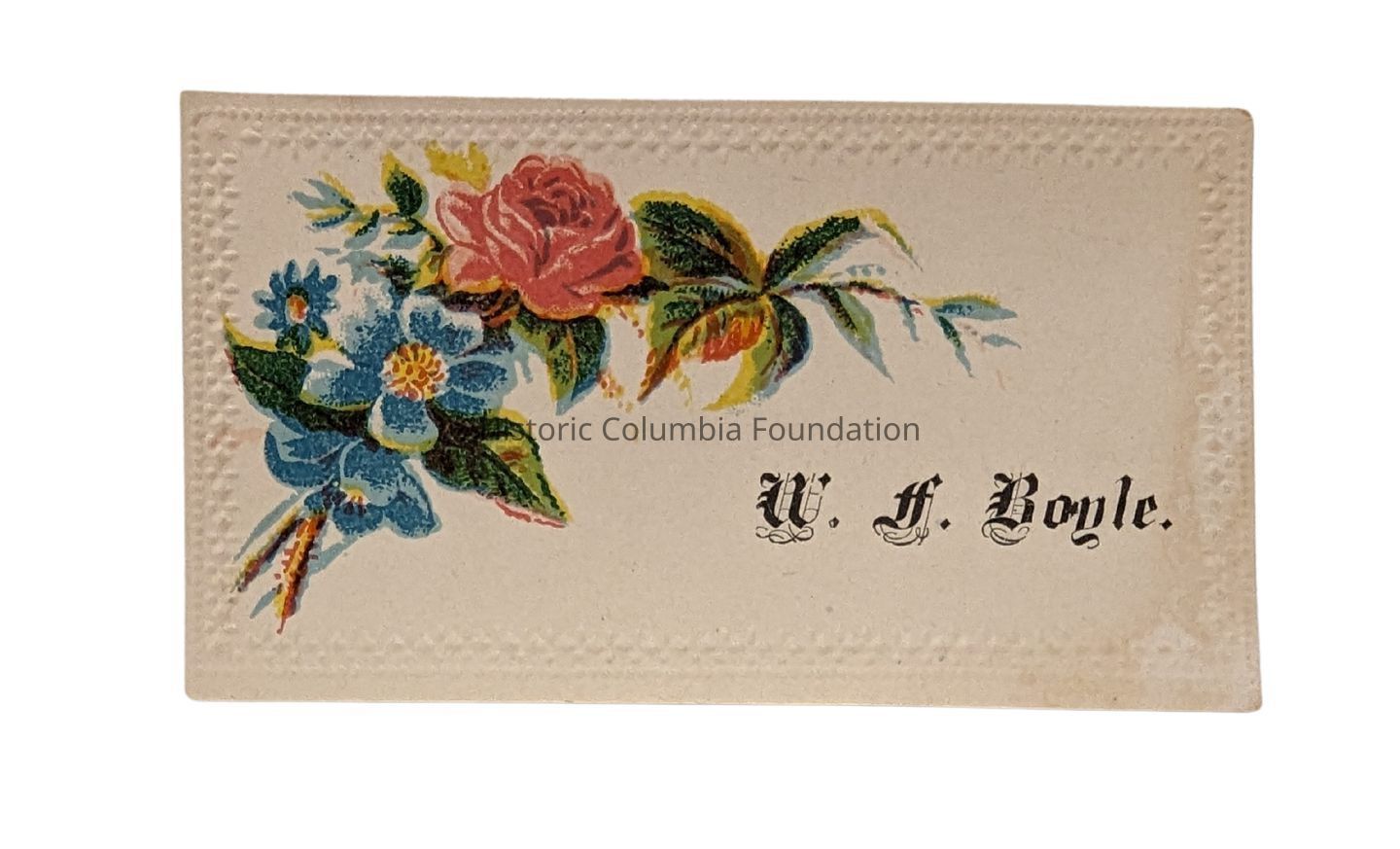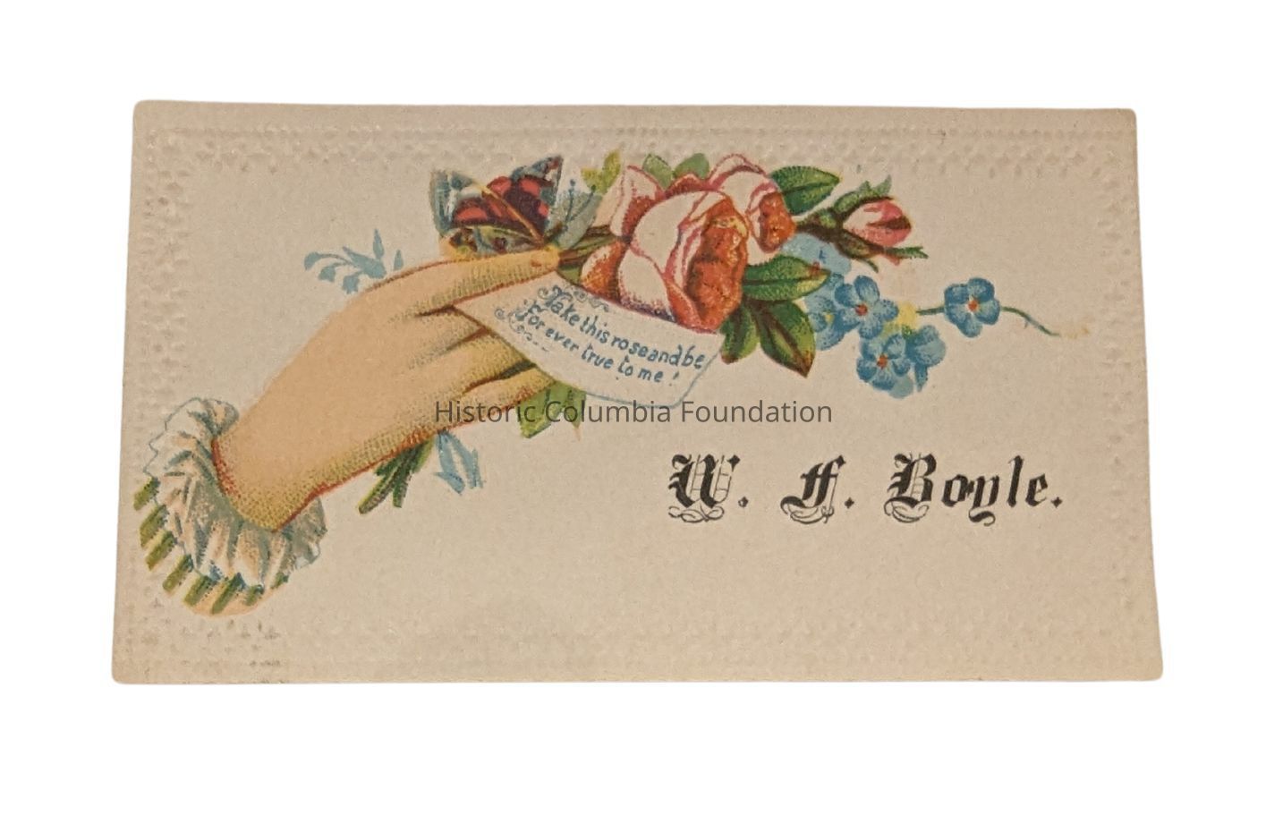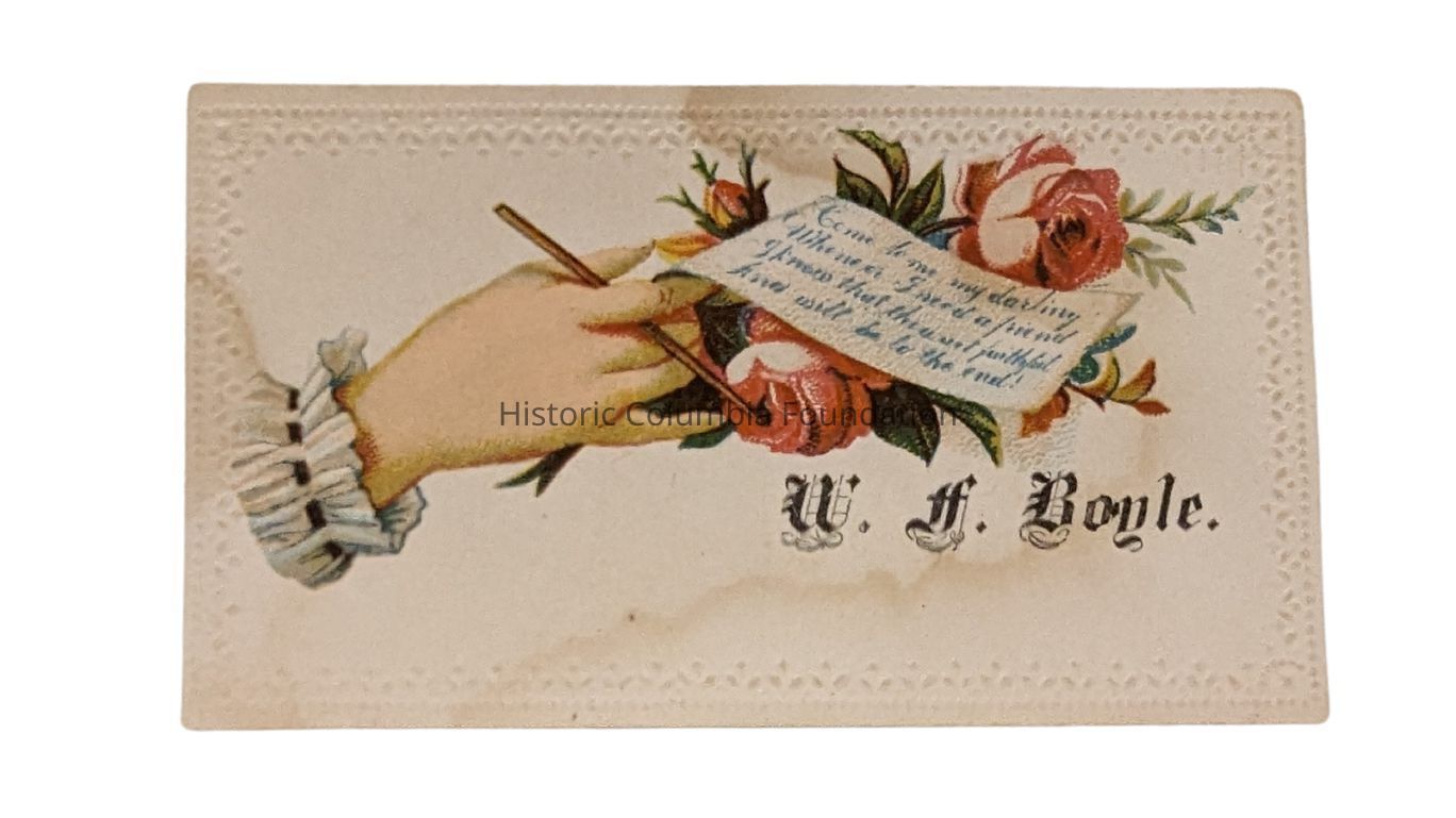 Seven calling cards belonging to "W. F. Boyle," whose name is printed on the cards. Cards A and B depict a hand holding flowers along with a note. The note on card A reads "Come to me my darling / Whenever I need a friend / I know that thou art faithful / And will be to the end!" Card B features the note "Take this rose and be / Forever true to me!"