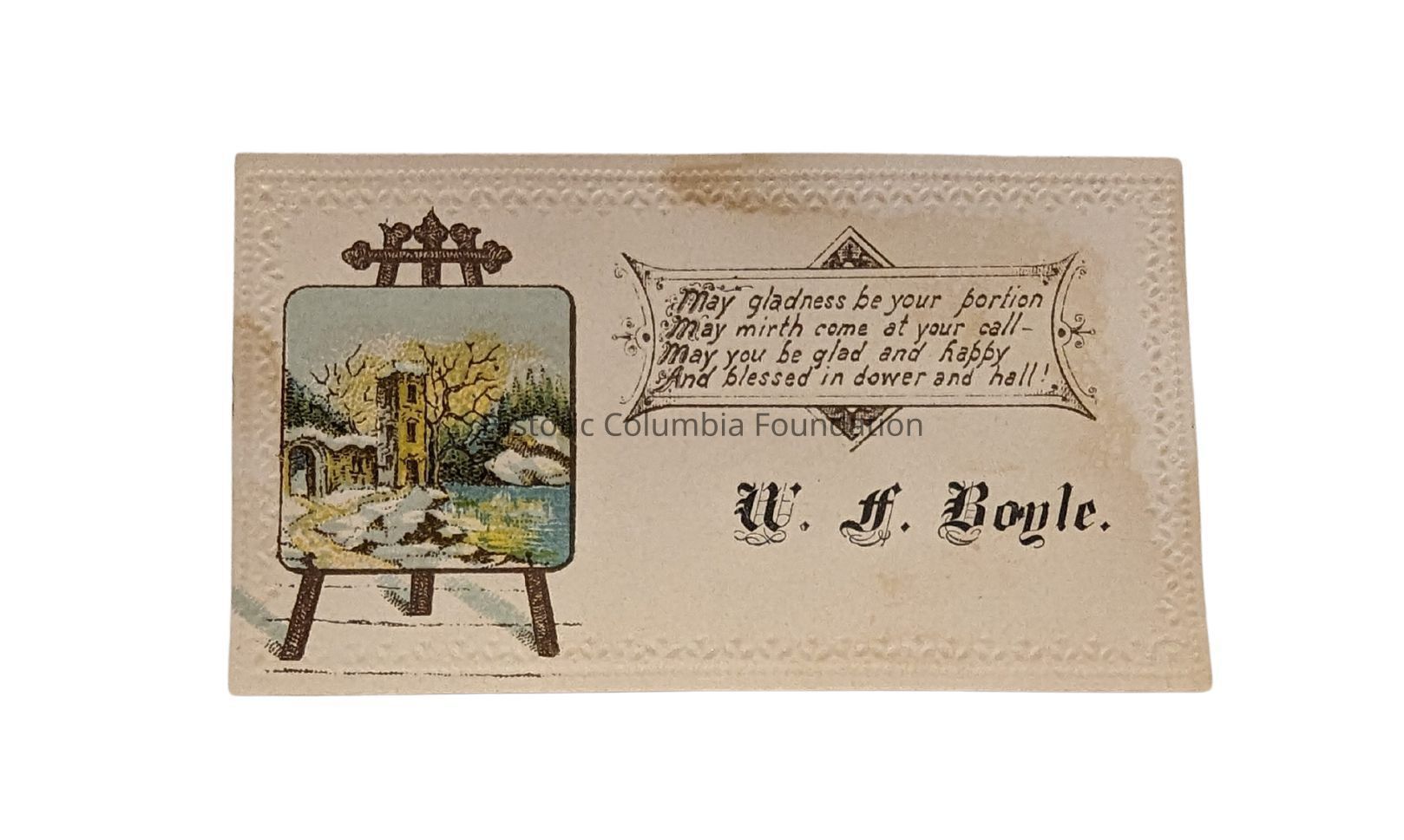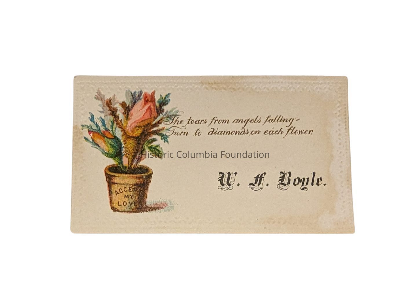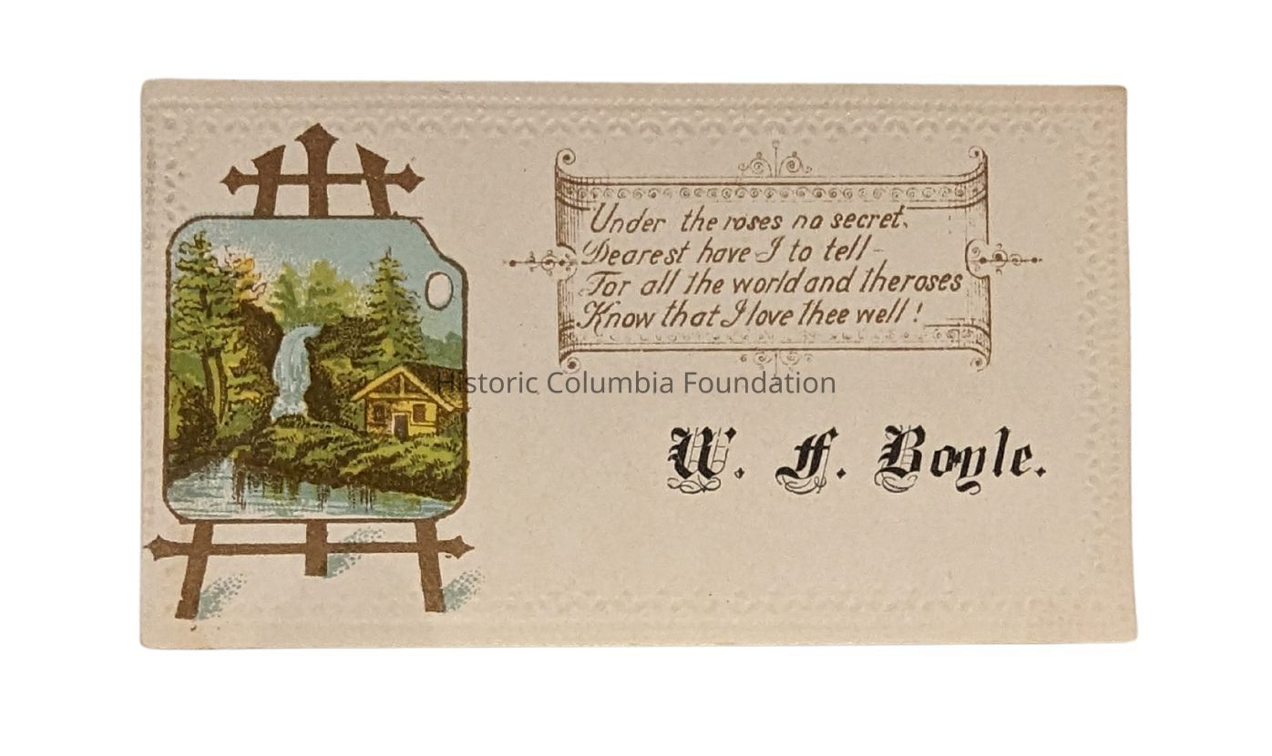 Seven calling cards belonging to "W. F. Boyle," whose name is printed on the cards. Cards A and B depict a hand holding flowers along with a note. The note on card A reads "Come to me my darling / Whenever I need a friend / I know that thou art faithful / And will be to the end!" Card B features the note "Take this rose and be / Forever true to me!"