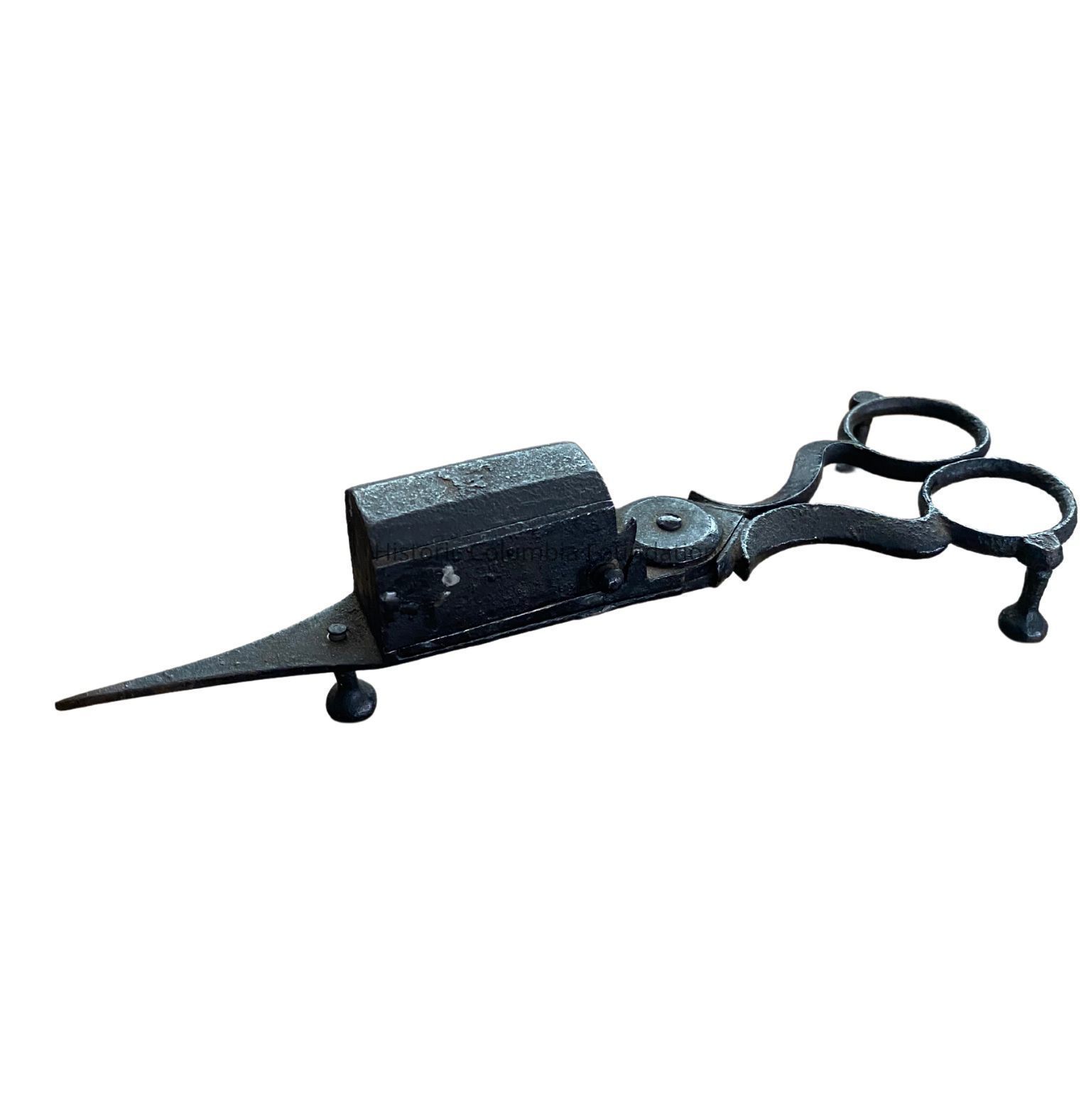 Hand-forged iron candle snuffer. It rests on three feet.
