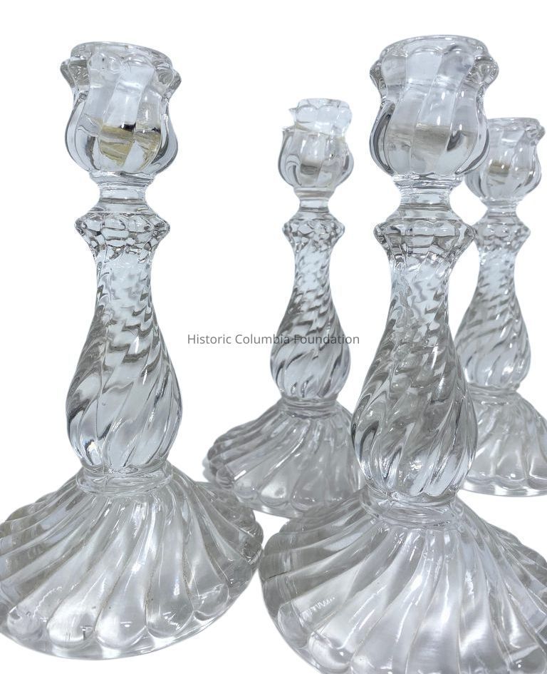 These candlesticks are part of the Colony Collection by Fostoria Glass Company. Founded in Fostoria, Ohio, in 1887, the glass company moved to Moundsville, West Virginia, in 1891. There, the company began to promote their wares nationally and attracted government commissions from Washington, D.C. In the twentieth century, Fostoria was the largest maker of handmade glassware in the United States and, by 1950, produced over million pieces of glass annually. In 1986, Fostoria closed after belatedly introducing automatic machinery and struggling to compete with domestic and foreign competition.Made/Created
