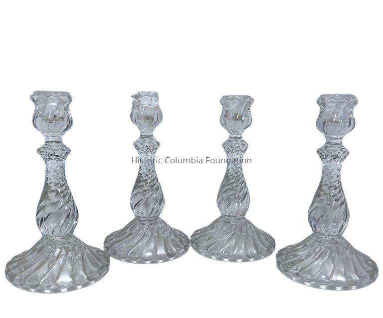 Four molded glass candlesticks. The identical clear glass candlesticks feature a twisted rib shape around the sconce, stem, and base.Context