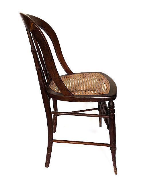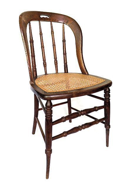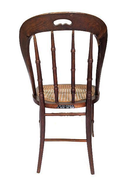 Two brown wooden cane bottom chairs. Each chair has four spindles on the back and has tapered legs. A modern label on the reverse of each of the chairs reads, "This Chair Belonged To Dr. And Mrs. James Woodrow."Use