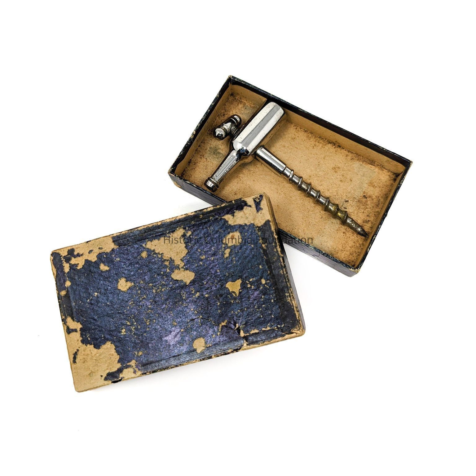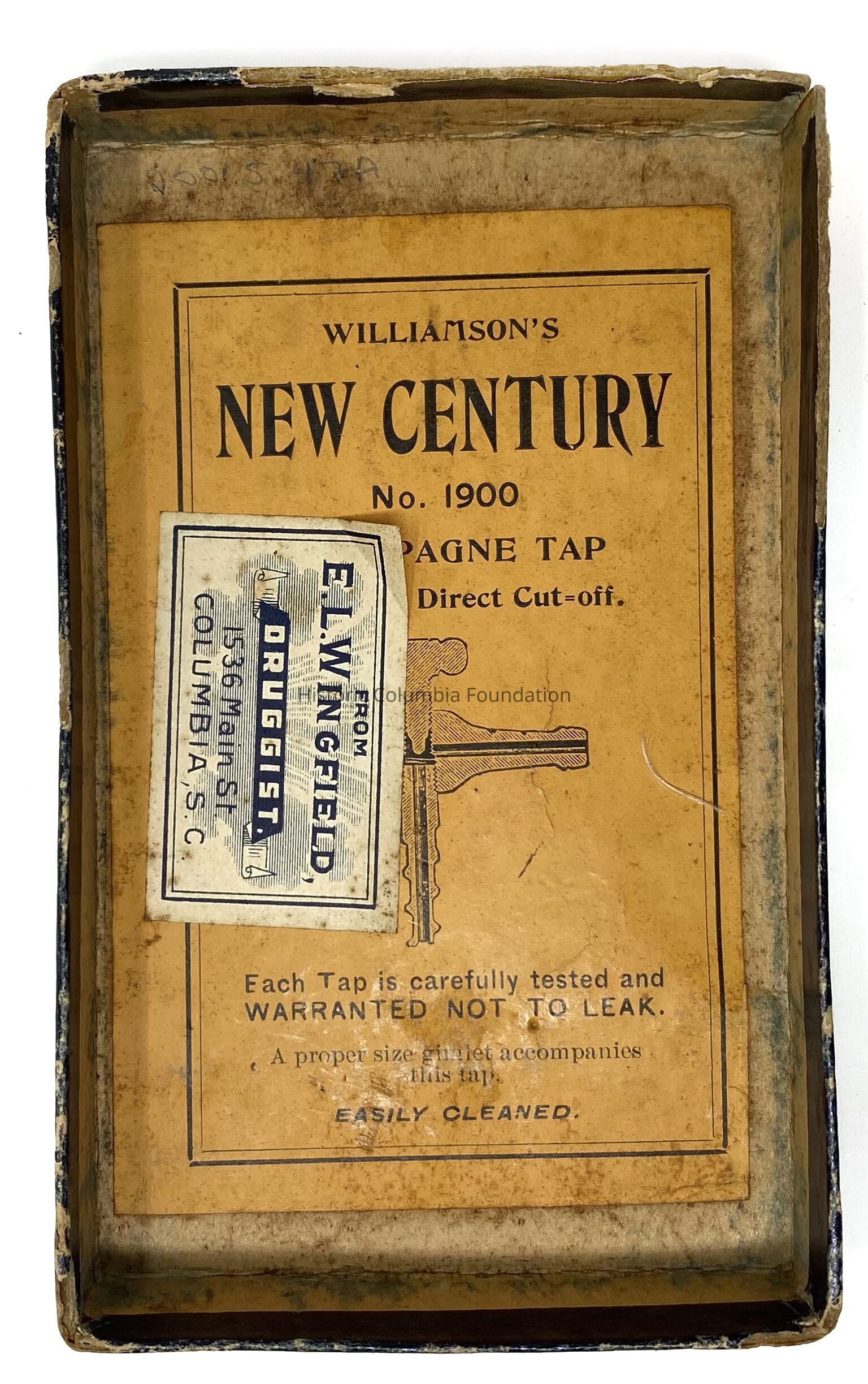 This particular champagne tap was sold by Dr. Emmet Lee Wingfield (1872-1936), who operated a drug store at 1536 Main Street in Columbia from 1900 until 1914. Although labeled as “easily cleaned,” it is unclear whether this tap was ever used.Made/Created