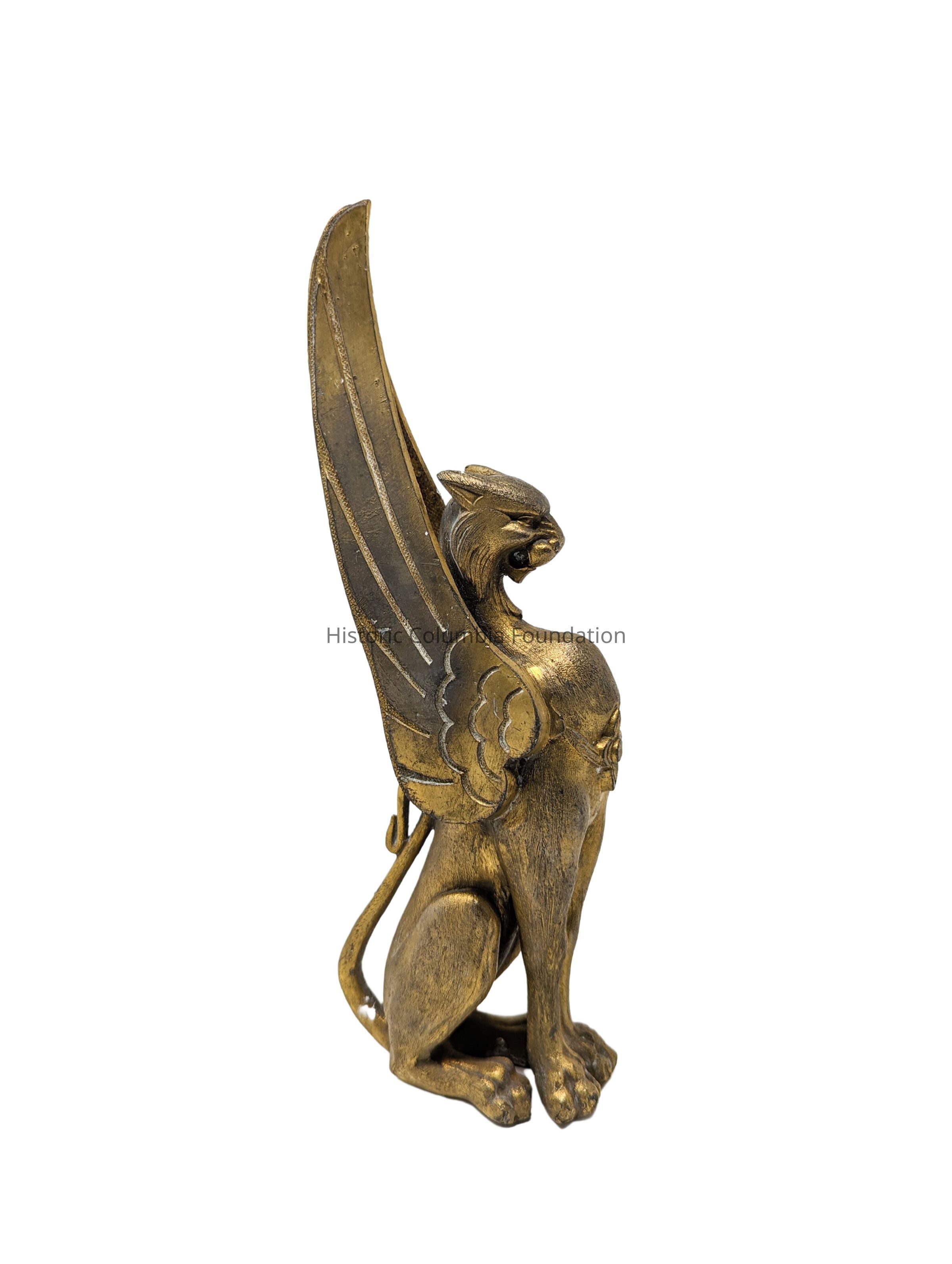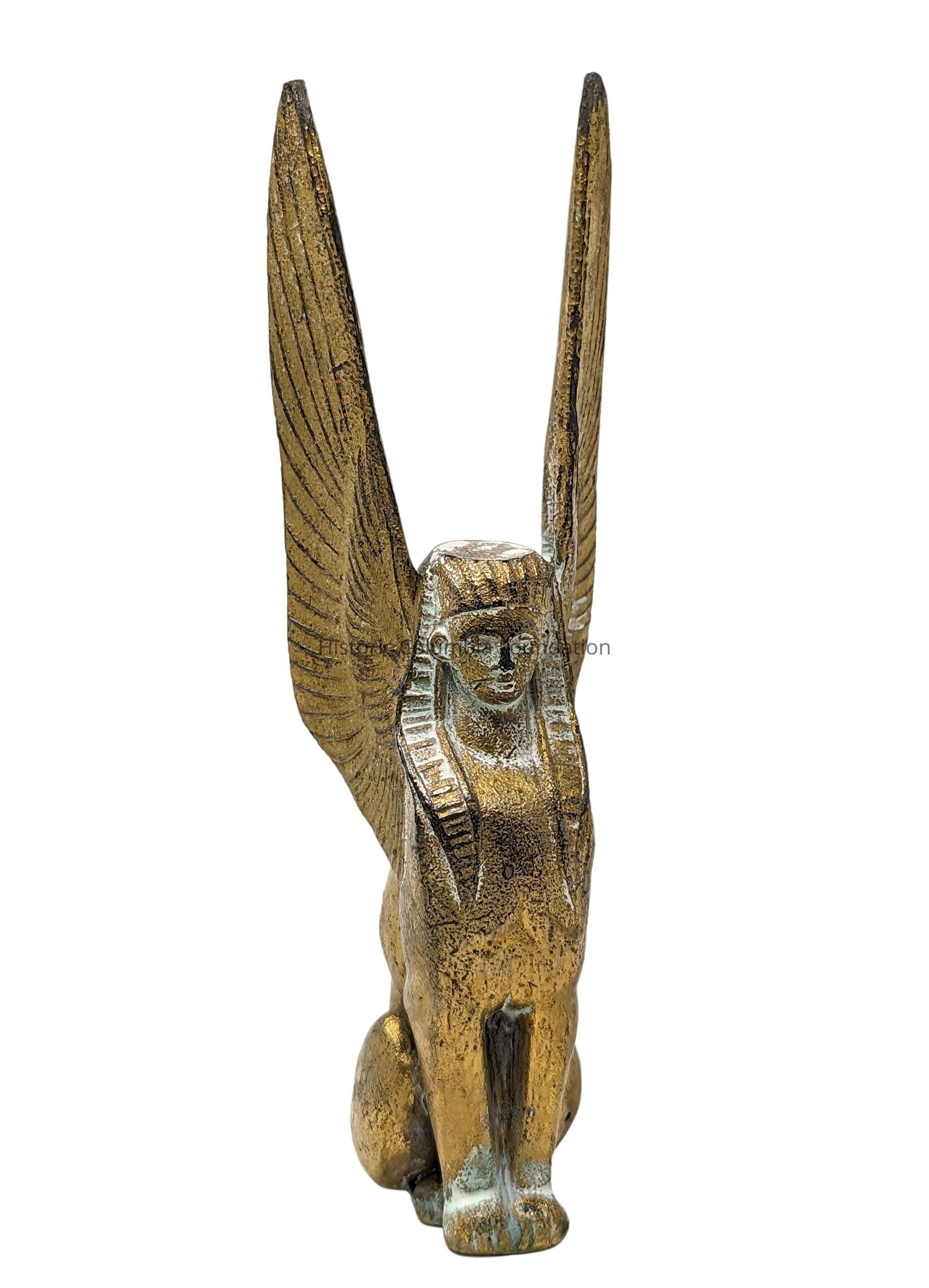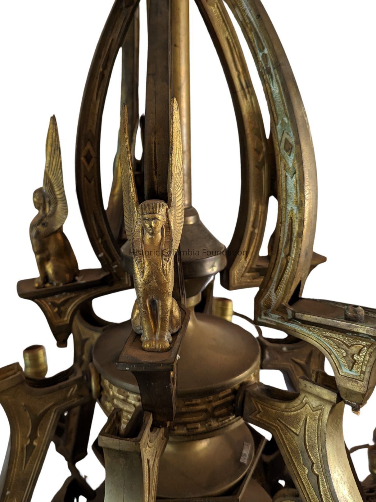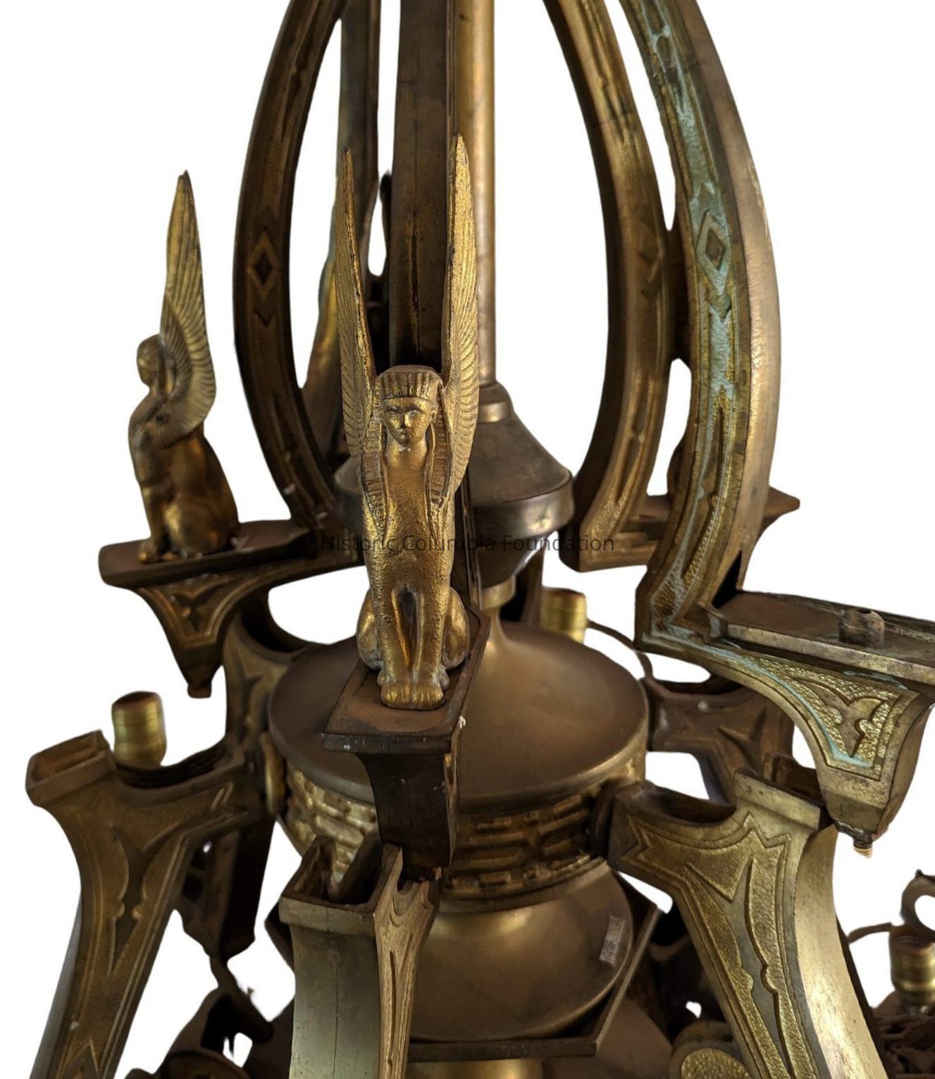 Egyptian Revival bronze chandelier with 12 lights. The chandelier includes three large sphinxes, one smaller sphinx, and five glass shades, that were blown, molded, and frosted. The chandelier also includes a circular disc and a gasolier fixture.Context