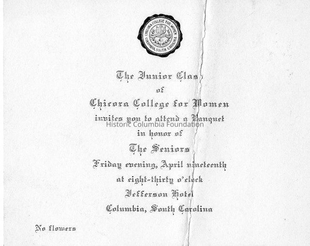The Chicora College Junior-Senior Banquet was held at the Jefferson Hotel in downtown Columbia. Opened in 1913, the hotel catered to elite, white locals and travelers alike. The date aligns with either the year 1918 or 1929, as Chicora College for Women was in operation at the Hampton-Preston Mansion in Columbia from 1915-1930.