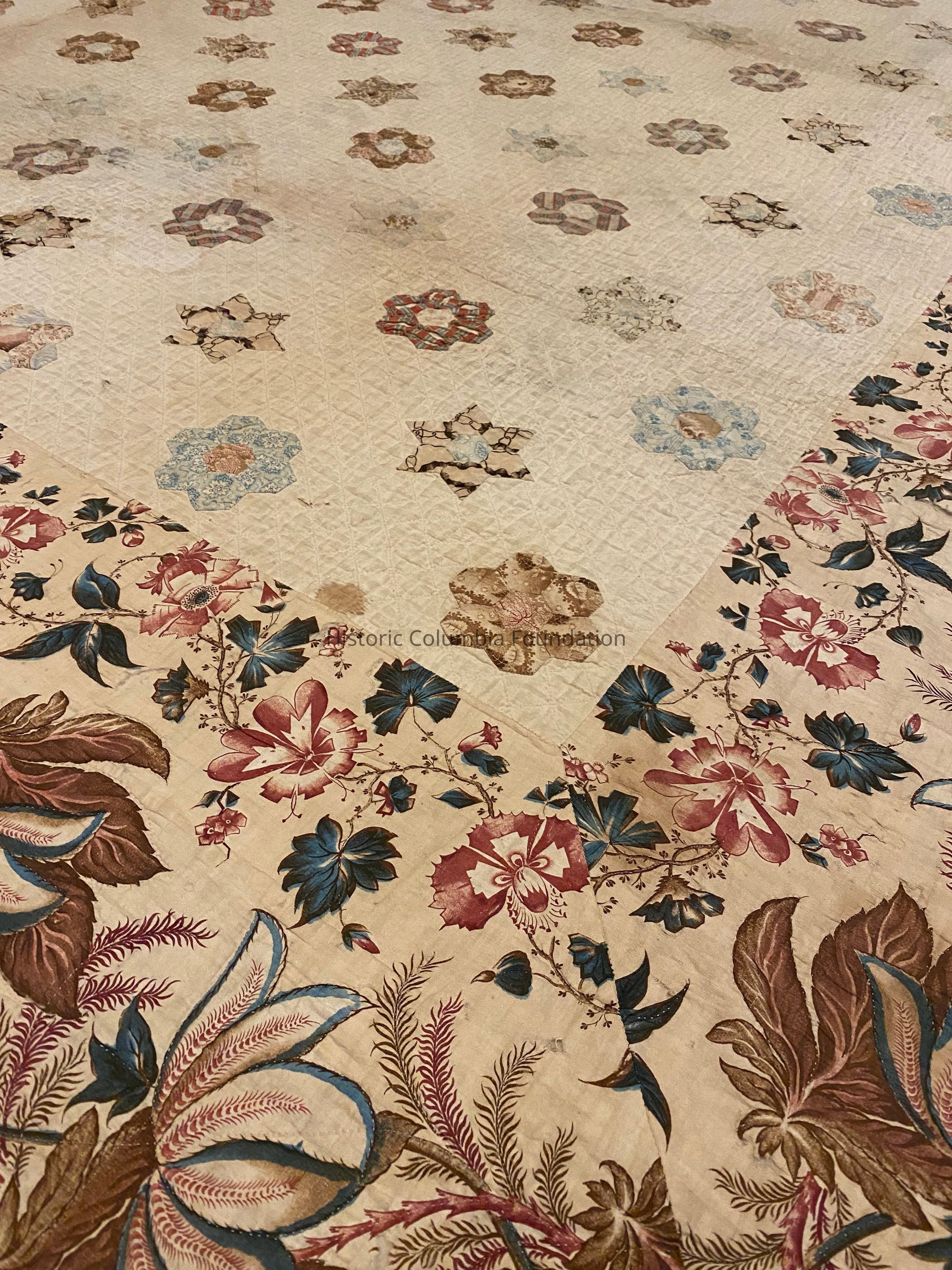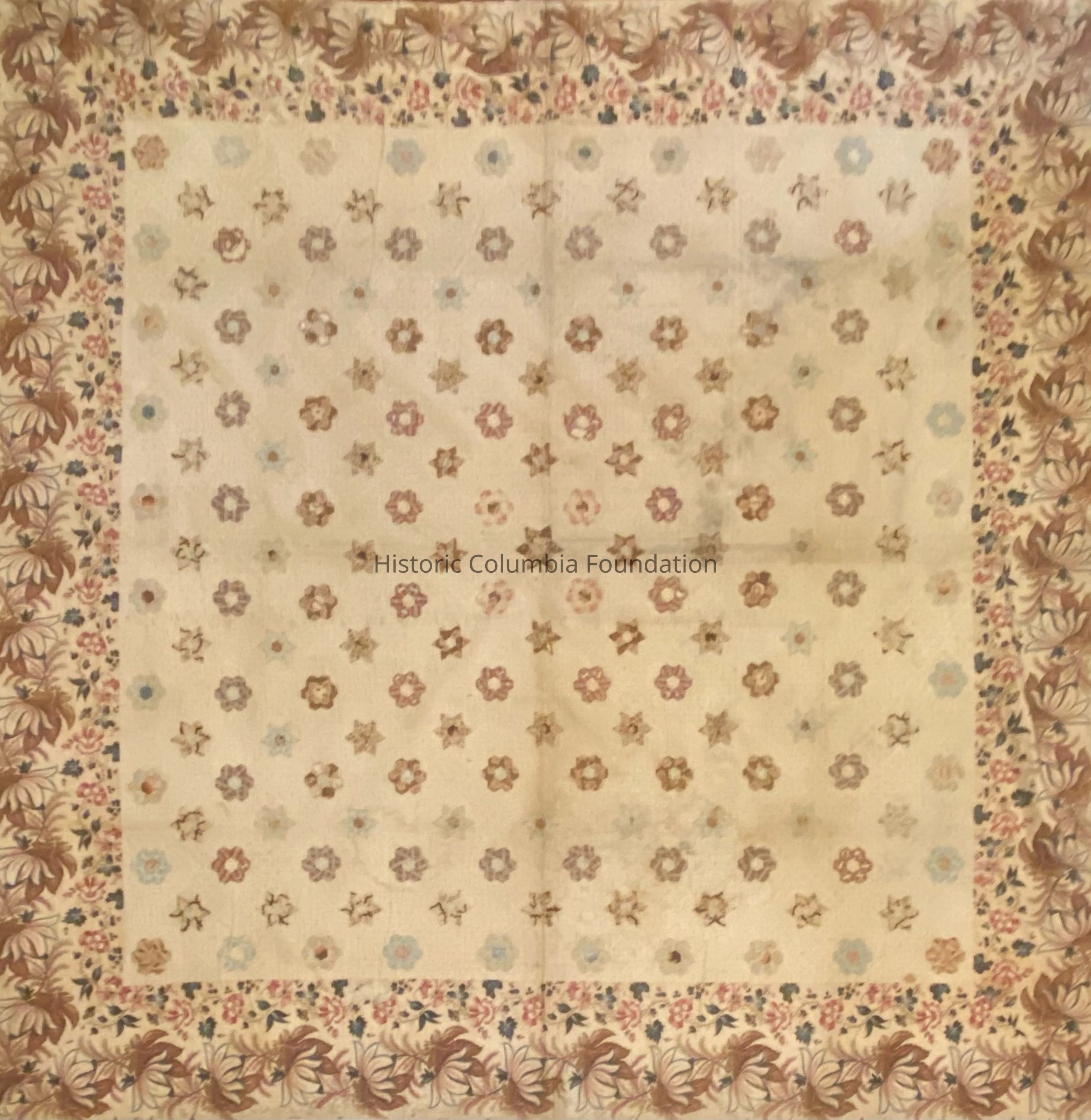 Appliqued hand-quilted quilt with large floral-print border and a central field of natural color with six-pointed hexagonal stars. The piece is labeled in cross-stitched on back, "Eliza C. Murchison Orangeburgh So Ca. to Aaron B Jones Manchester CT April 16, 1833."Context
