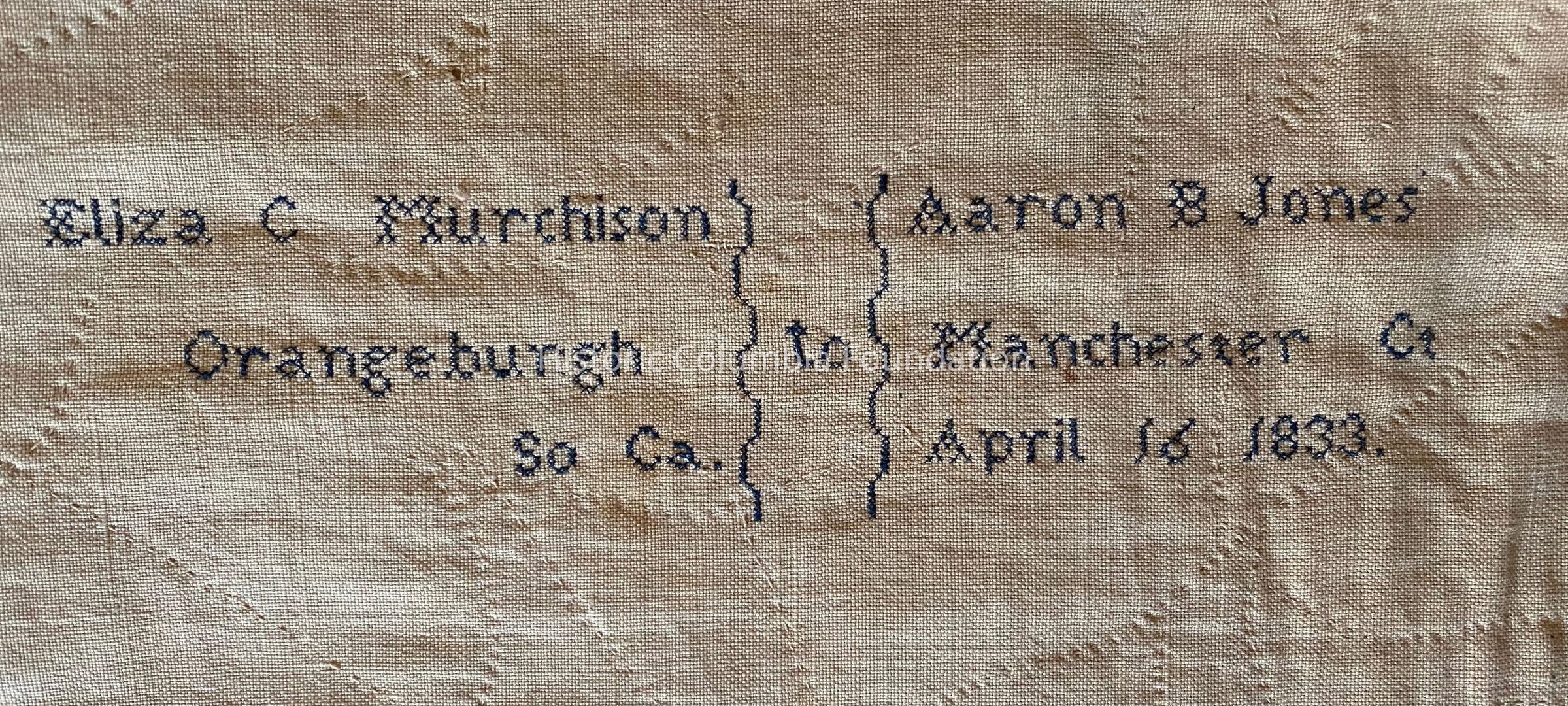 This quilt, signed on the back in cross-stitch, was completed by Eliza Campbell Jones Murchison (1793-1870) of Orangeburg, South Carolina, in 1833. Eliza was the daughter of Revolutionary War solider Samuel Phillips Jones (1759-1836) and Jane Bruce (1764-1802). Like her father, Eliza was born in Hartford, Connecticut, before the family relocated to Jane's home state of South Carolina.