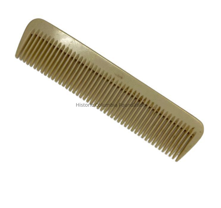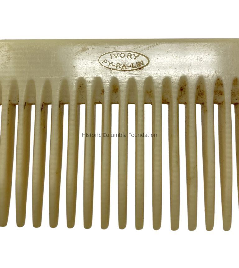 Tan comb made celluloid. A maker's mark reads "IVORY PY-RA-LIN."Context