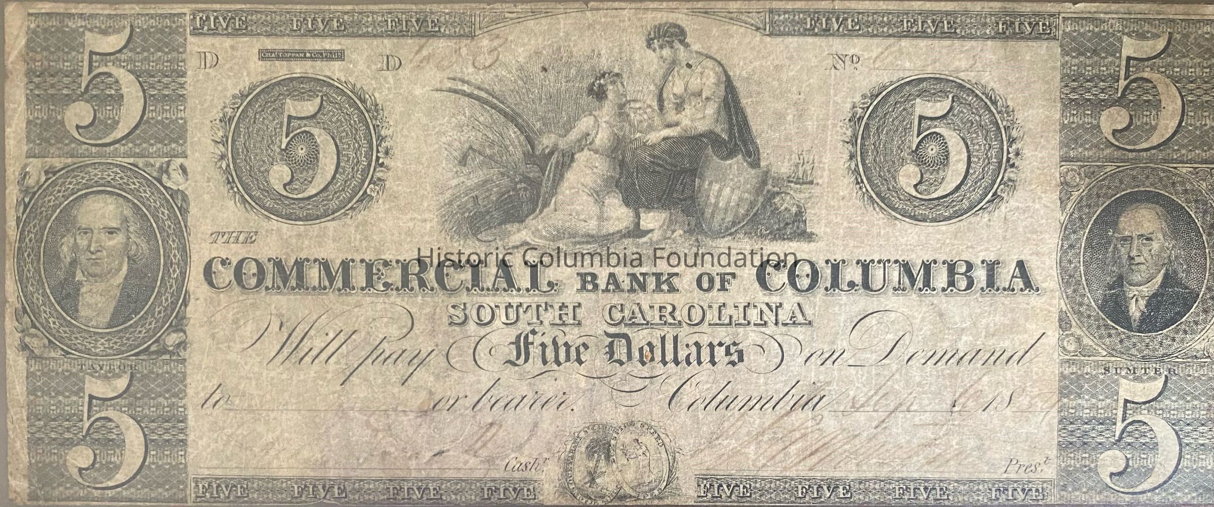 Printed by Charles Toppan & Co. of Philadelphia on watermarked paper, this $5 note issued by the Commercial Bank of Columbia in 1854 features a depiction of the South Carolina state seal and medallion portraits of South Carolina revolutionaries and statesmen General Thomas Taylor (1770-1832) and General Thomas Sumter (1734-1832). The bank's president at the time, John A. Crawford (1797-1876), and cashier, Edwin J. Scott (1803-1884), would remain in their roles until the bank's destruction during the burning of Columbia in February 1865. At the time of its destruction, the bank–located on the west side of Richardson (Main) Street–held $800,000 in capital.Made/Created